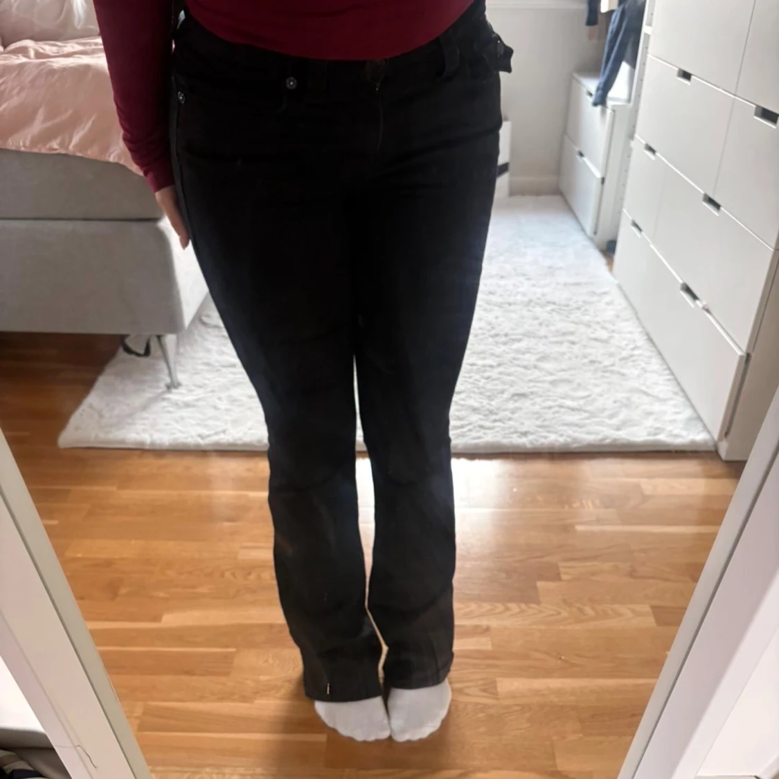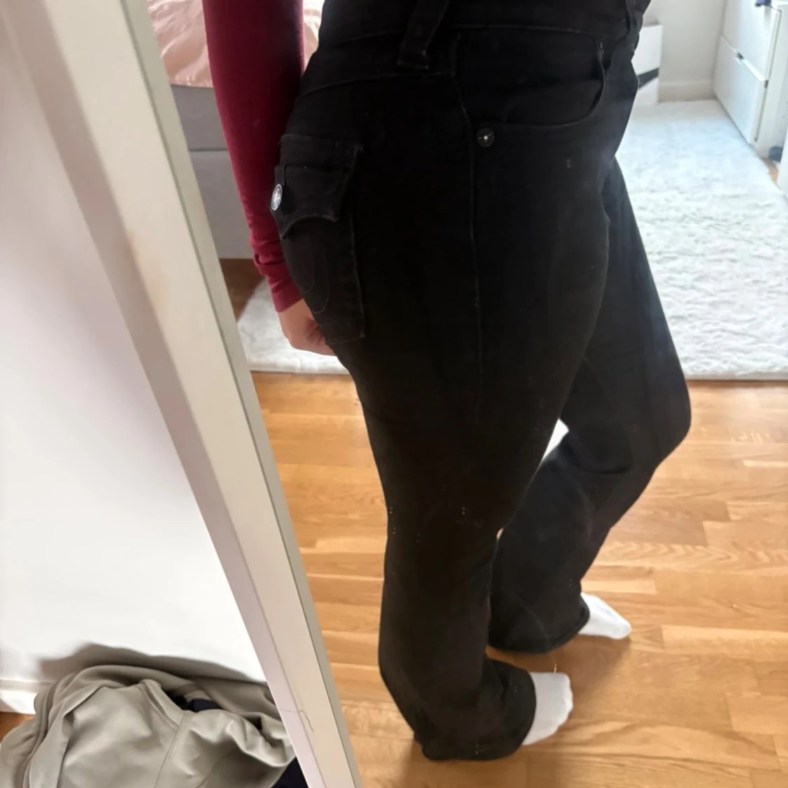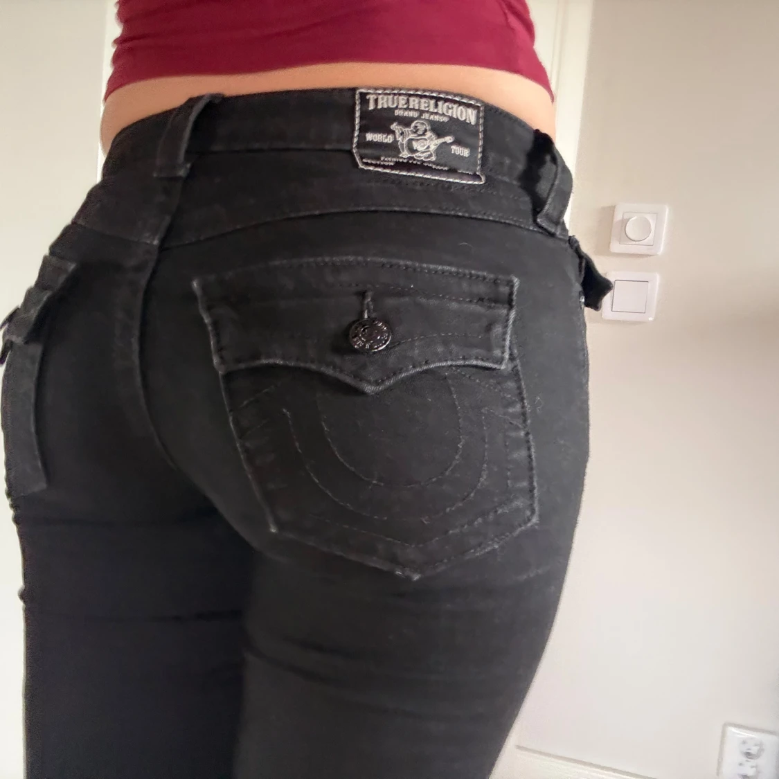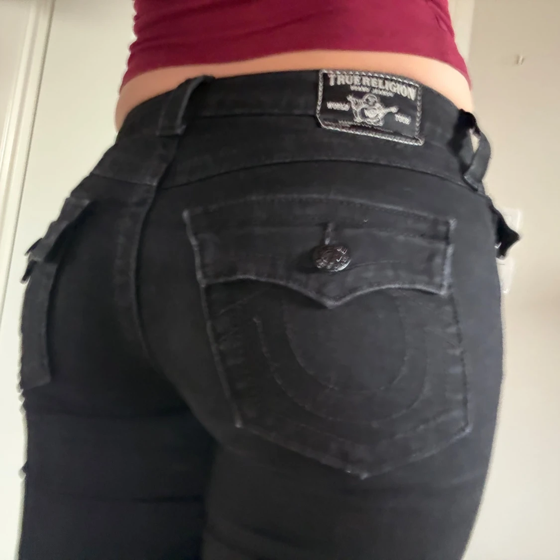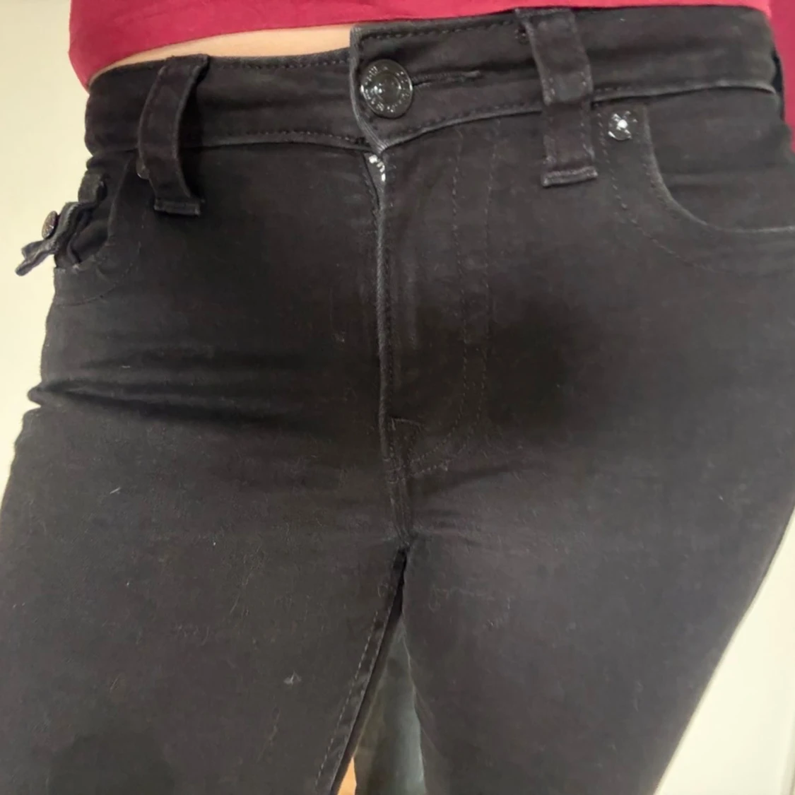 Säljer ett par svarta jeans från True religion med bootcut-modell i low waist. Byxorna har klassiska fickor fram och bak, samt extra fickdetalj med knapp på sidan. Snygg passform och stretchigt material som sitter bekvämt hela dagen. Coola svarta detaljer. Nypris 1299 kr