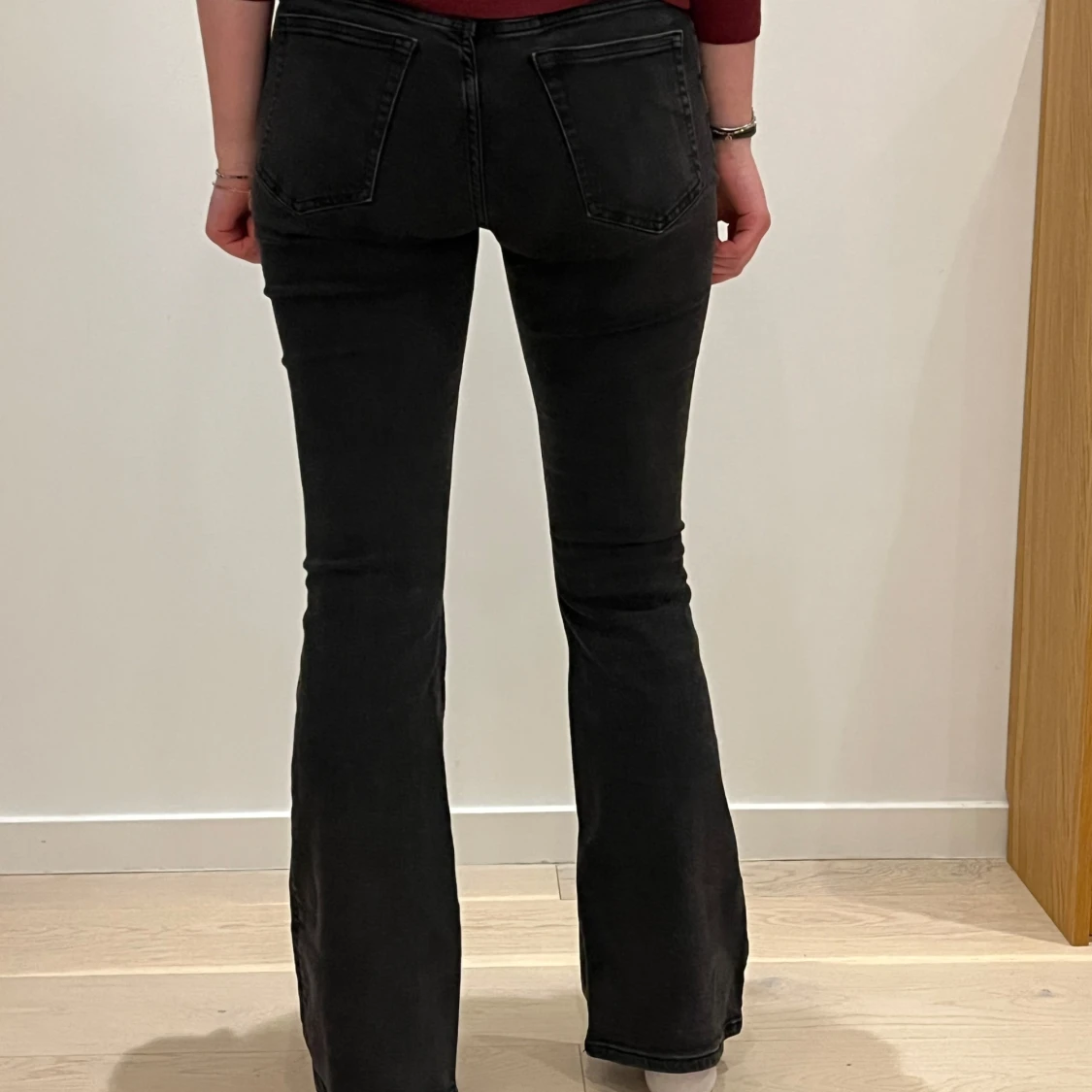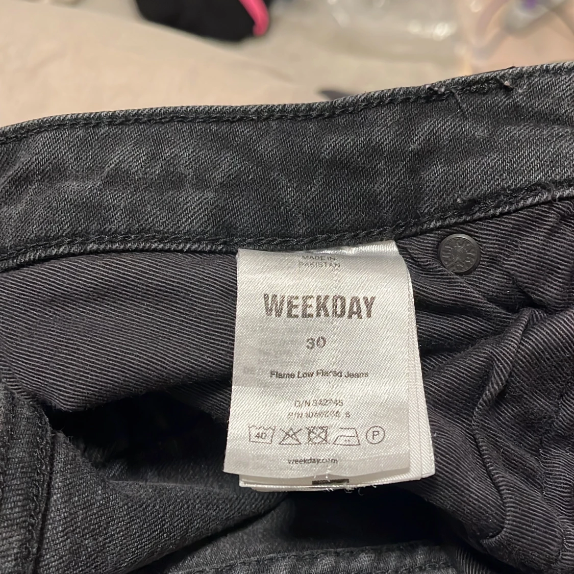 Washed black bootcut jeans från Weekday i modellen ”Flame”. I storlek 30, uppskattar till M/38 med midjemåttet 37cm tvärs över. Bara att skriva om fler bilder önskas💕