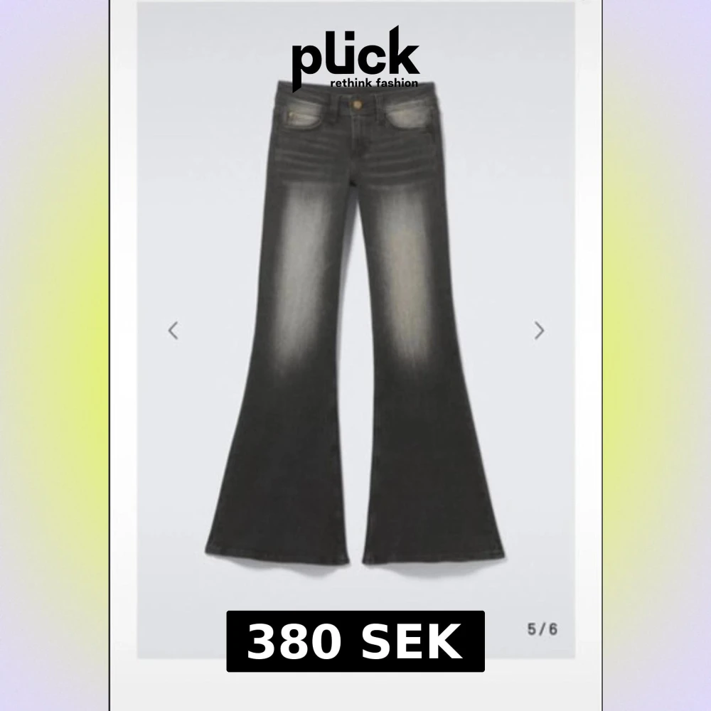 Snygga svarta bootcut jeans från Weekday med slitna detaljer och ljusare partier framtill. Jeansen har klassisk femficksdesign, knapp och dragkedja i gylfen. Perfekta för dig som gillar en retroinspirerad look med utsvängda ben. S-xs