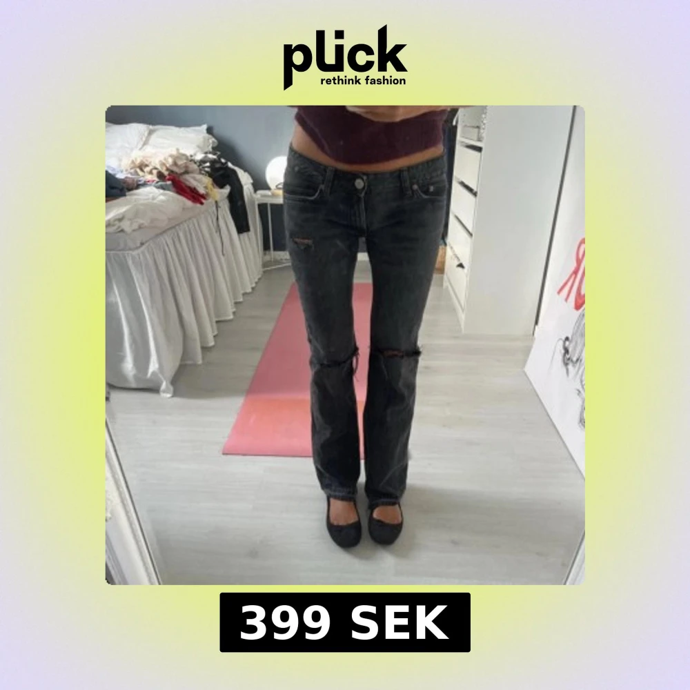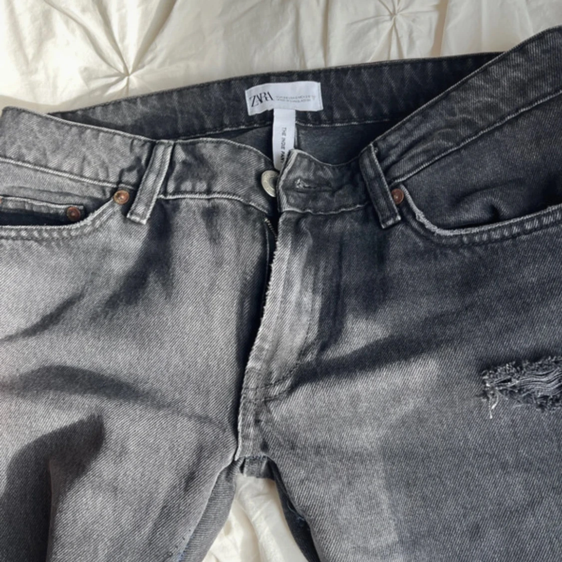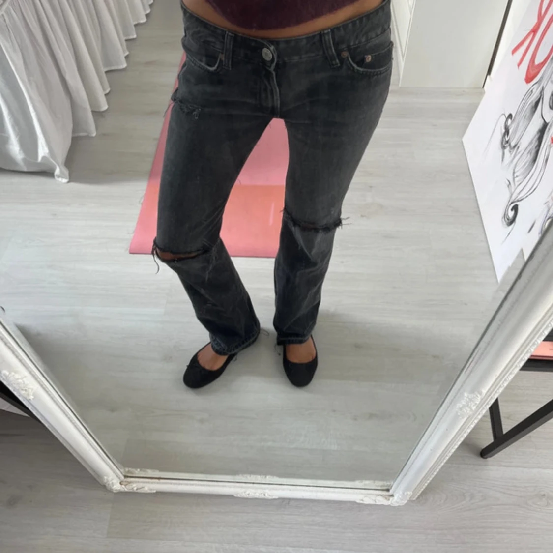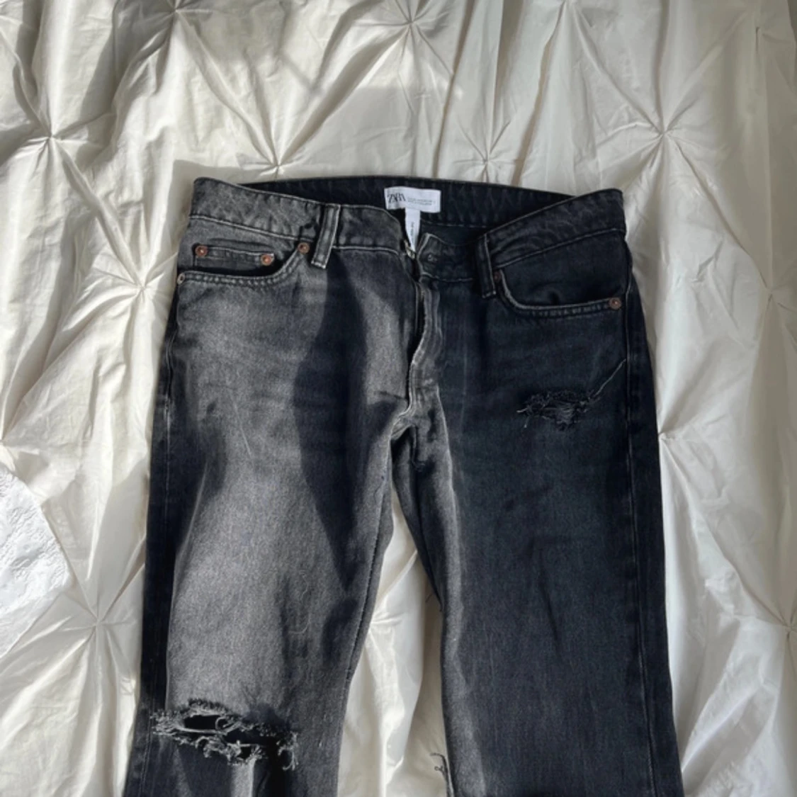 Säljer ett par svarta jeans från Zara med bootcut passform och låg midja. Jeansen har slitna detaljer vid knäna och klassisk femficksdesign. Materialet är jeans med en mörk tvätt som ger en cool vibe. Perfekt för dig som gillar en avslappnad och trendig stil. Sytt om dom själv till lågmidjat! Strl 38 men skulle säga 34/36 efter att sytt om dom