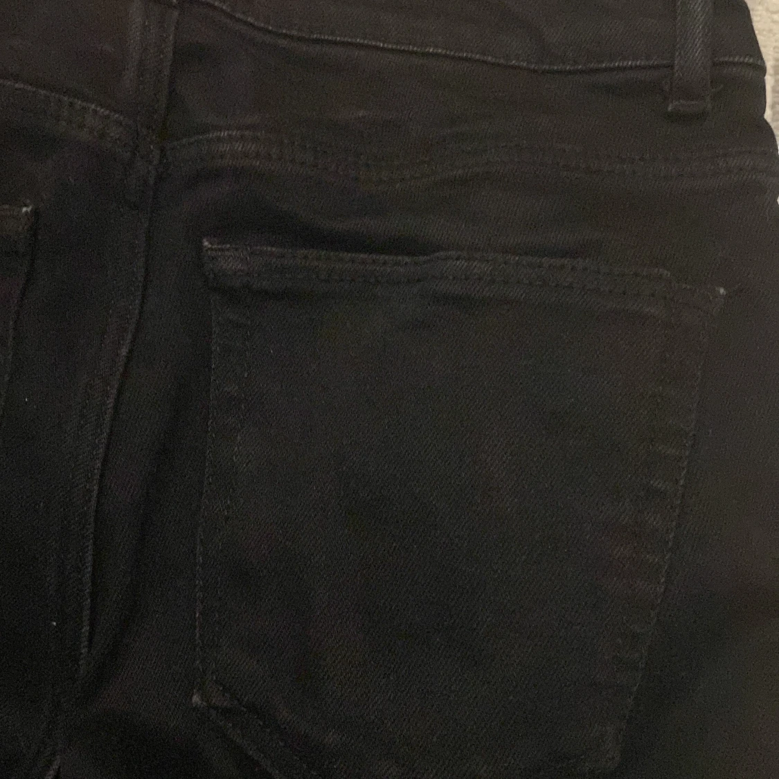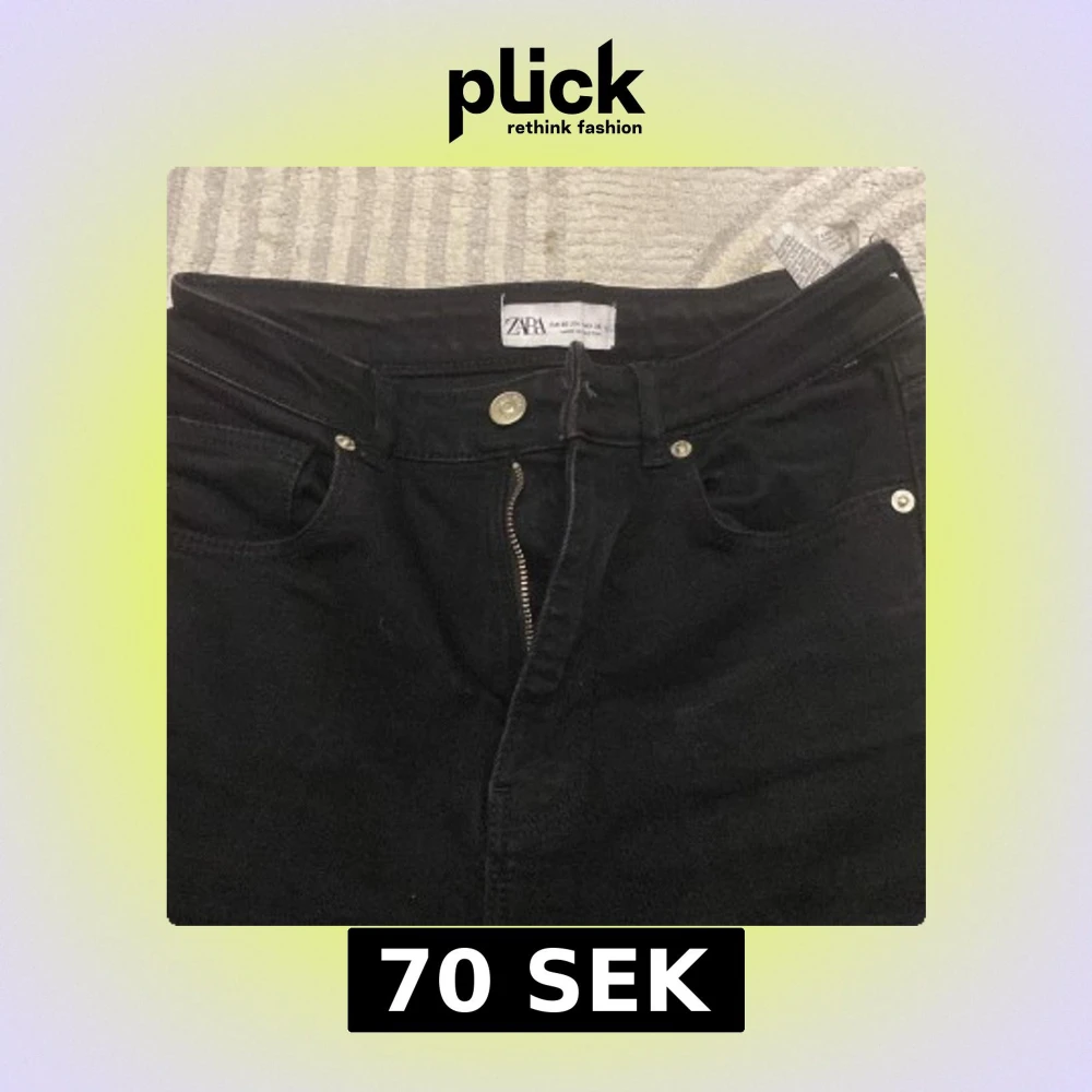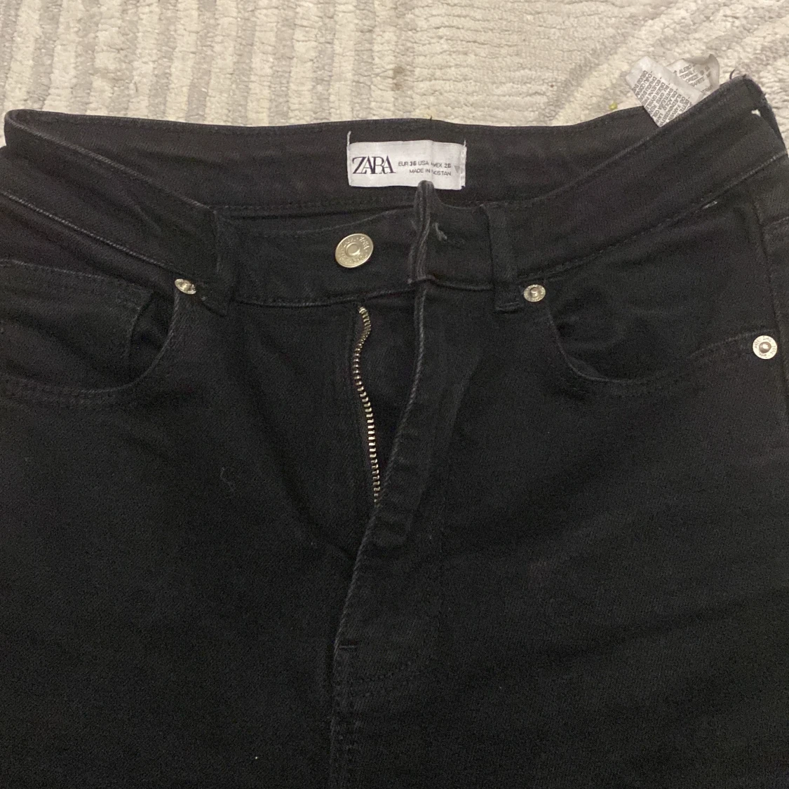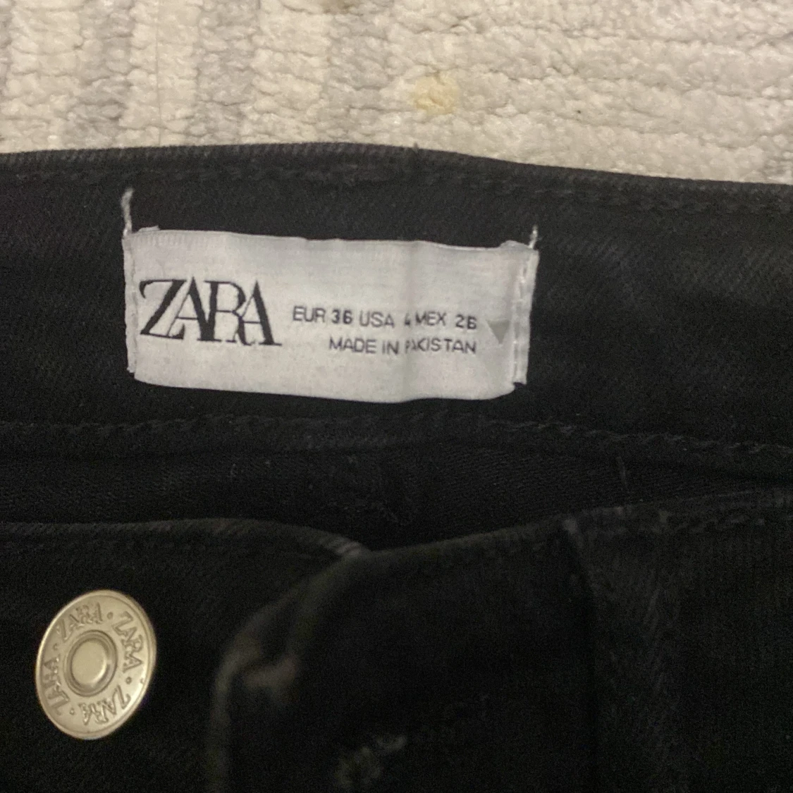 Svarta jeans från Zara i storlek 36 med klassisk femficksdesign, dragkedja och knapp framtill. Byxorna har bootcut-modell med lätt utsvängda ben och är tillverkade i ett mjukt jeanstyg. Perfekta för en trendig och avslappnad look.