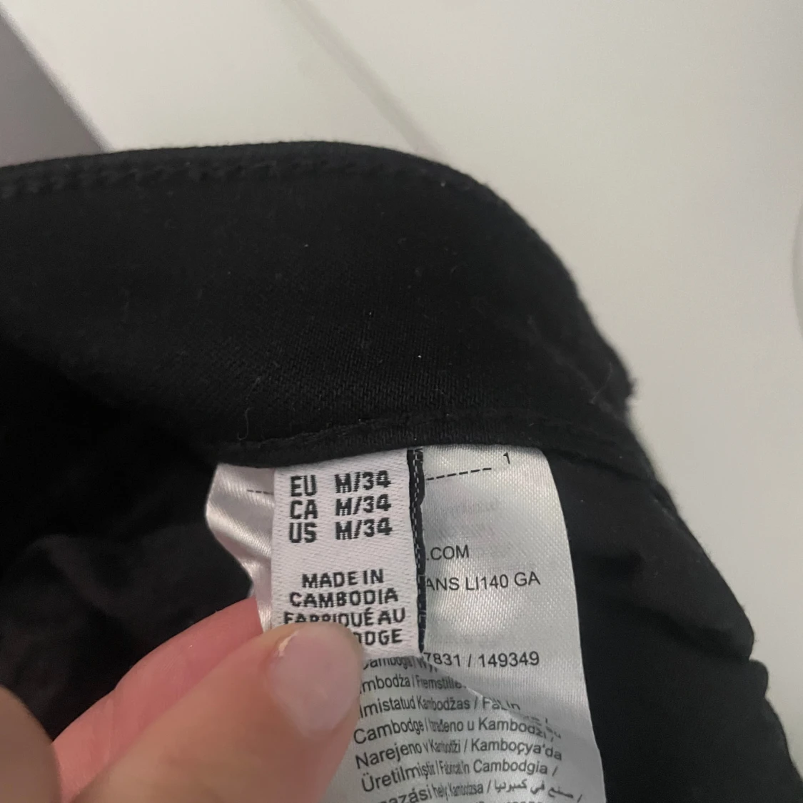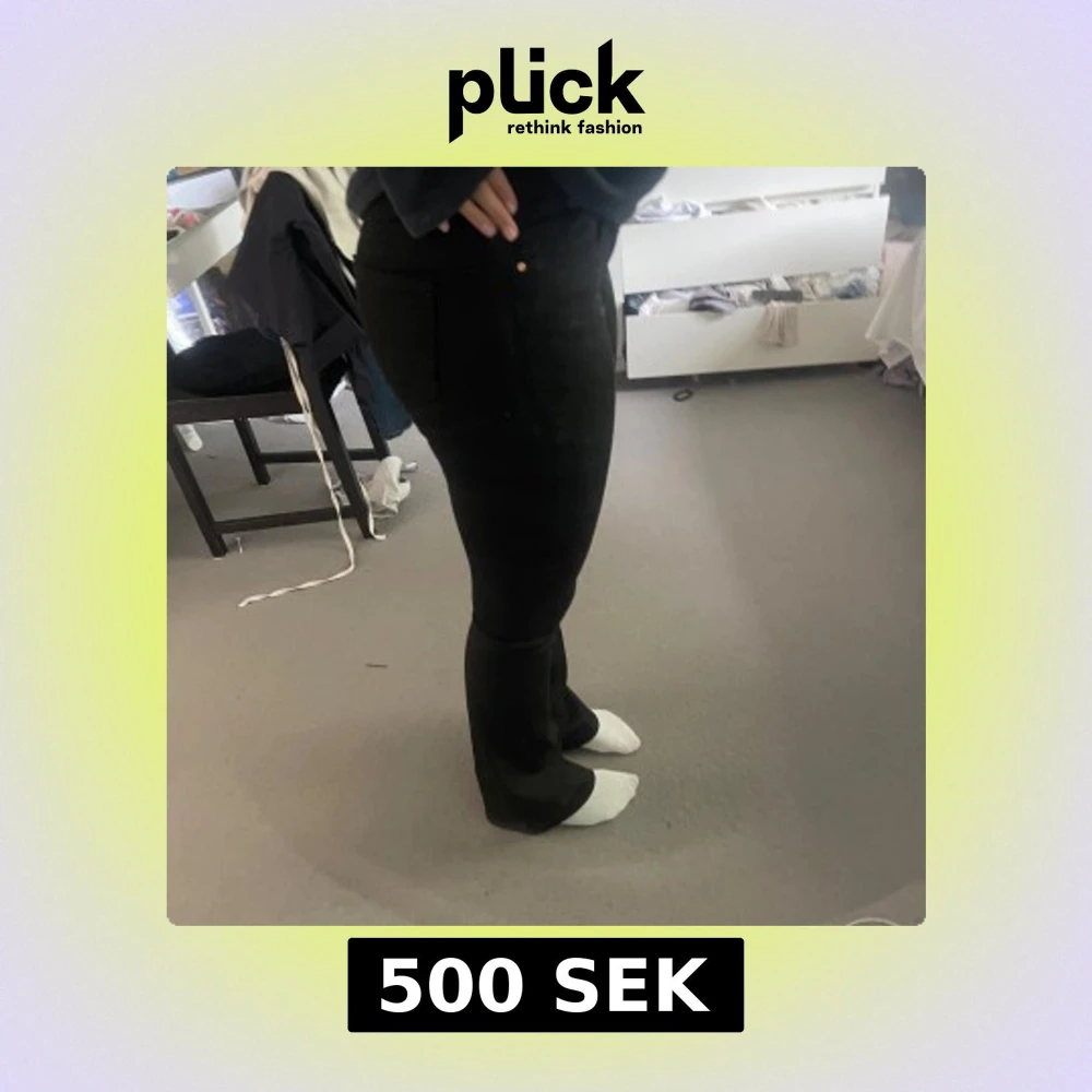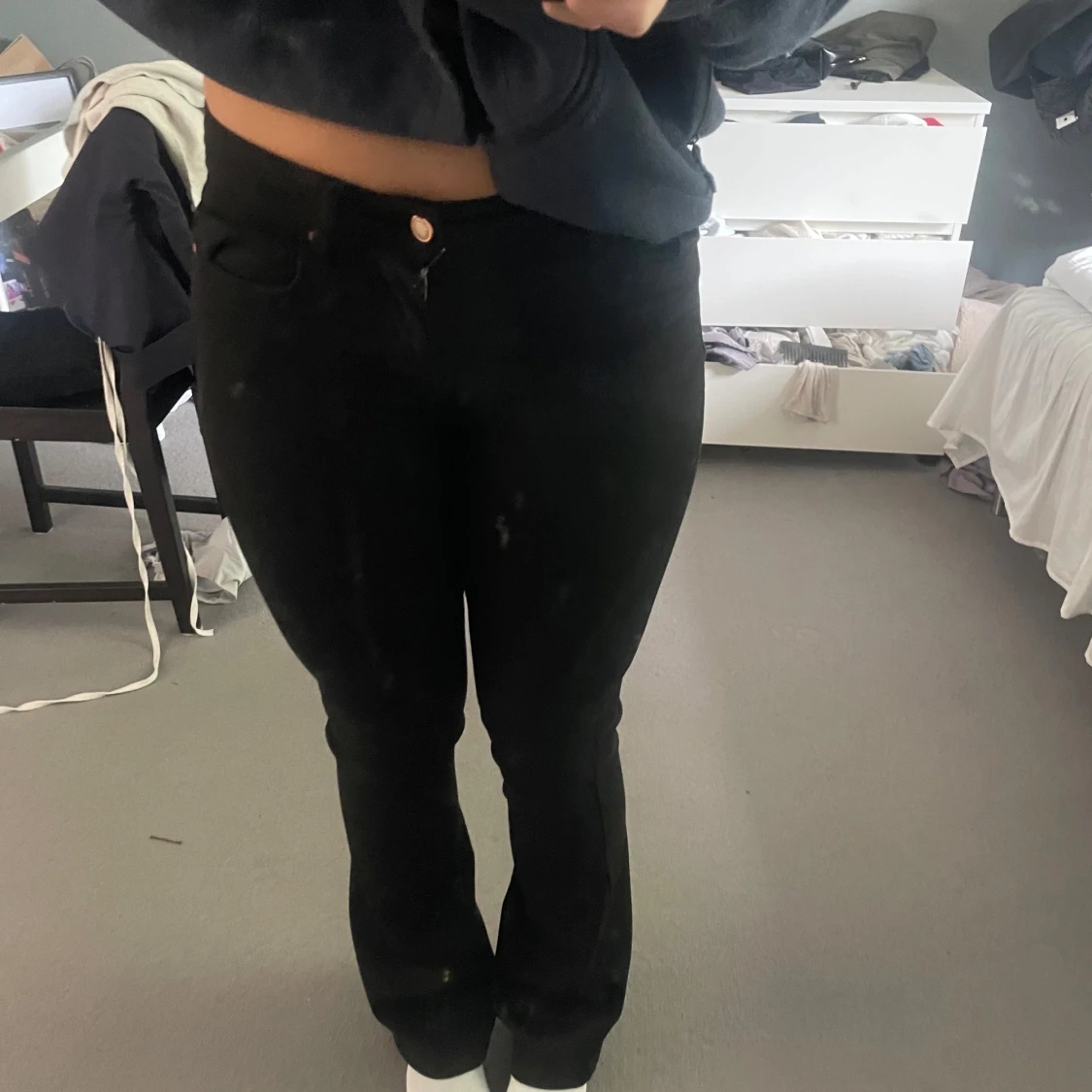 Säljer ett par svarta bootcut jeans i storlek M/34. Byxorna har klassisk femficksdesign, hög midja och är tillverkade i ett stretchigt bomullsmaterial. Snygga att styla med sneakers eller boots för en chill look.