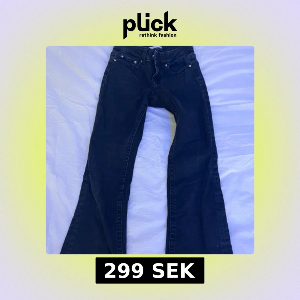 Snygga svarta bootcut jeans med låg midja och klassisk femficksdesign. Jeansen har en dragkedja och knappar framtill samt stiliga bakfickor med lock och knapp. Perfekta för en trendig look! Skriv för köpa eller frågor💗