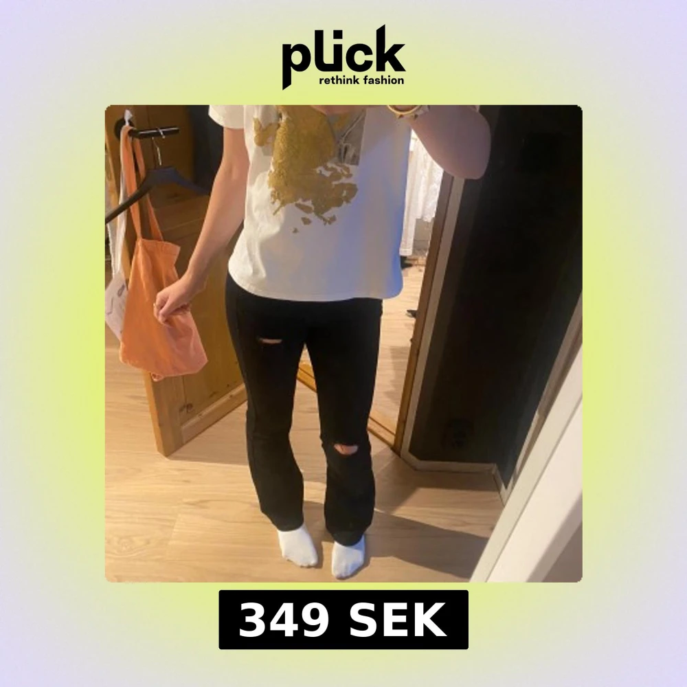 Säljer ett par svarta jeans med bootcut-modell och egengjorda hål. Jeansen är i stretchigt jeanstyg som sitter skönt💕