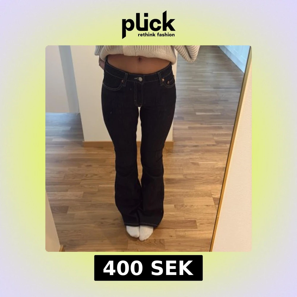 Snygga svarta jeans med bootcut passform och markerade vita sömmar. Jeansen har klassisk femficksdesign, låg midja och är tillverkade i ett stadigt denimtyg. Perfekta för dig som gillar en tidlös look med lite edge.