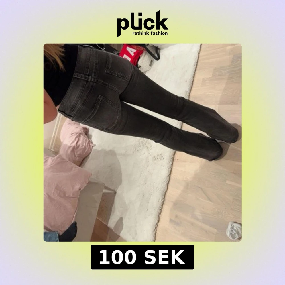 Säljer ett par svarta jeans med snygg bootcut och låg midja. Jeansen har klassiska fickor fram och bak, dubbla knappar och dragkedja. Från Gina young storlek 158, jag e 164 cm lång