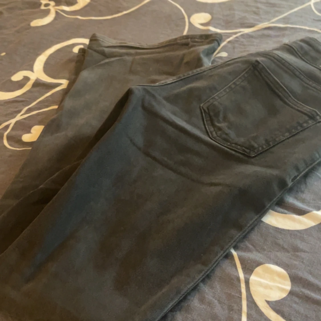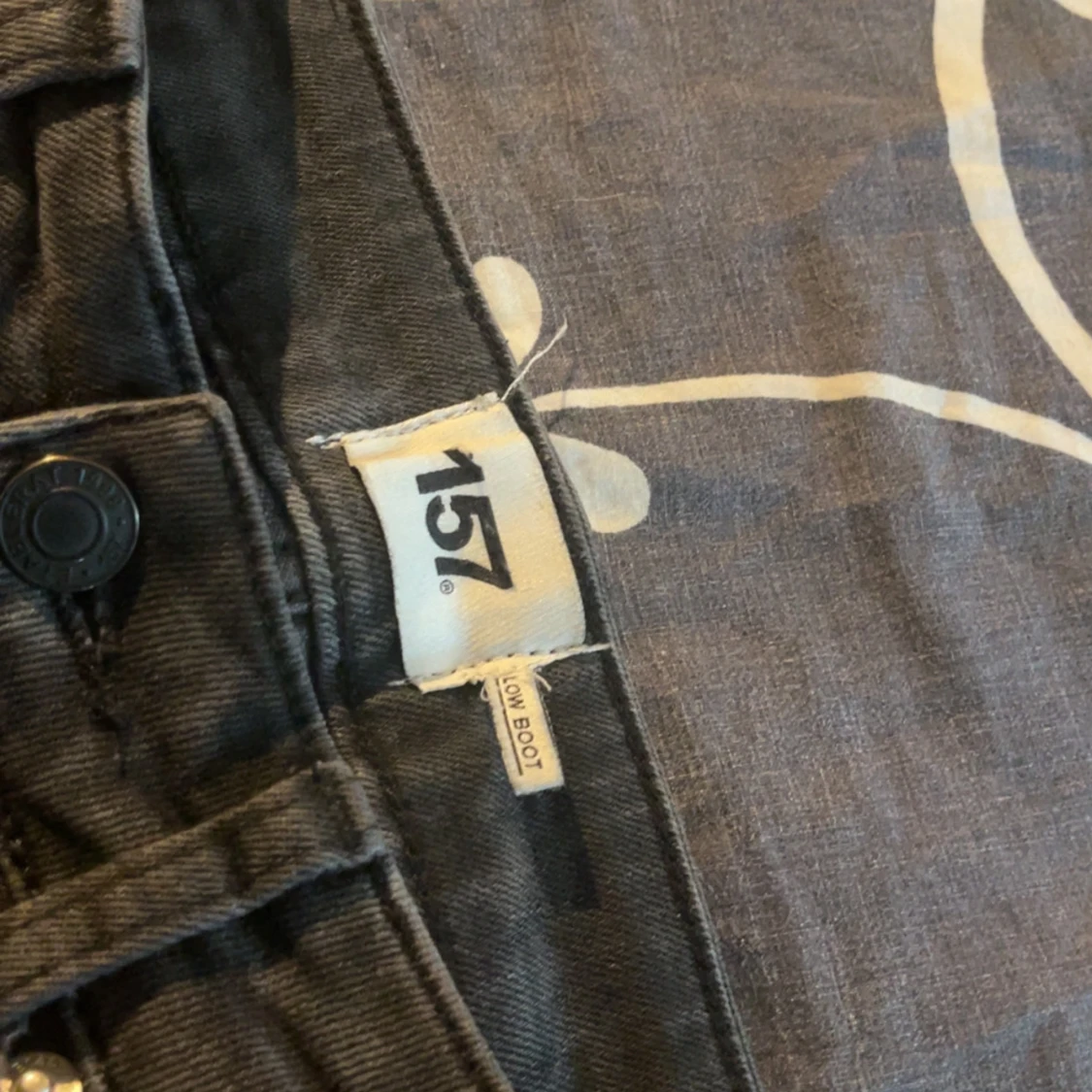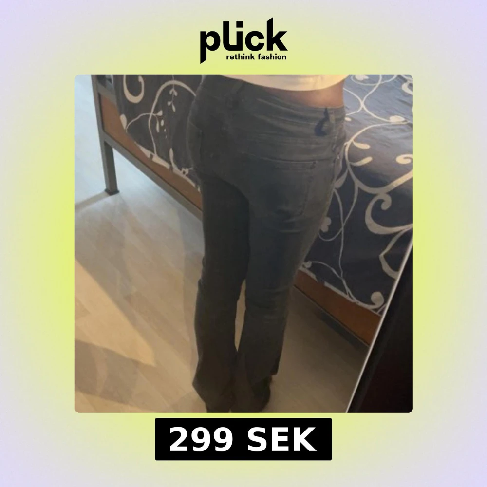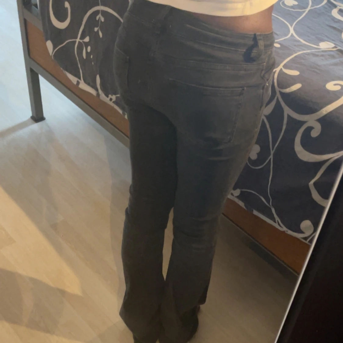 Säljer ett par svarta/grå jeans med bootcut-modell och låg midja. Jeansen har klassisk femficksdesign och är i ett stretchigt material som sitter snyggt över höfterna och låren. Perfekta för dig som gillar en tidlös och clean look.