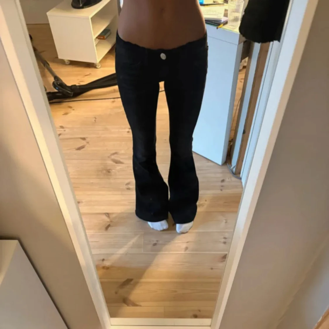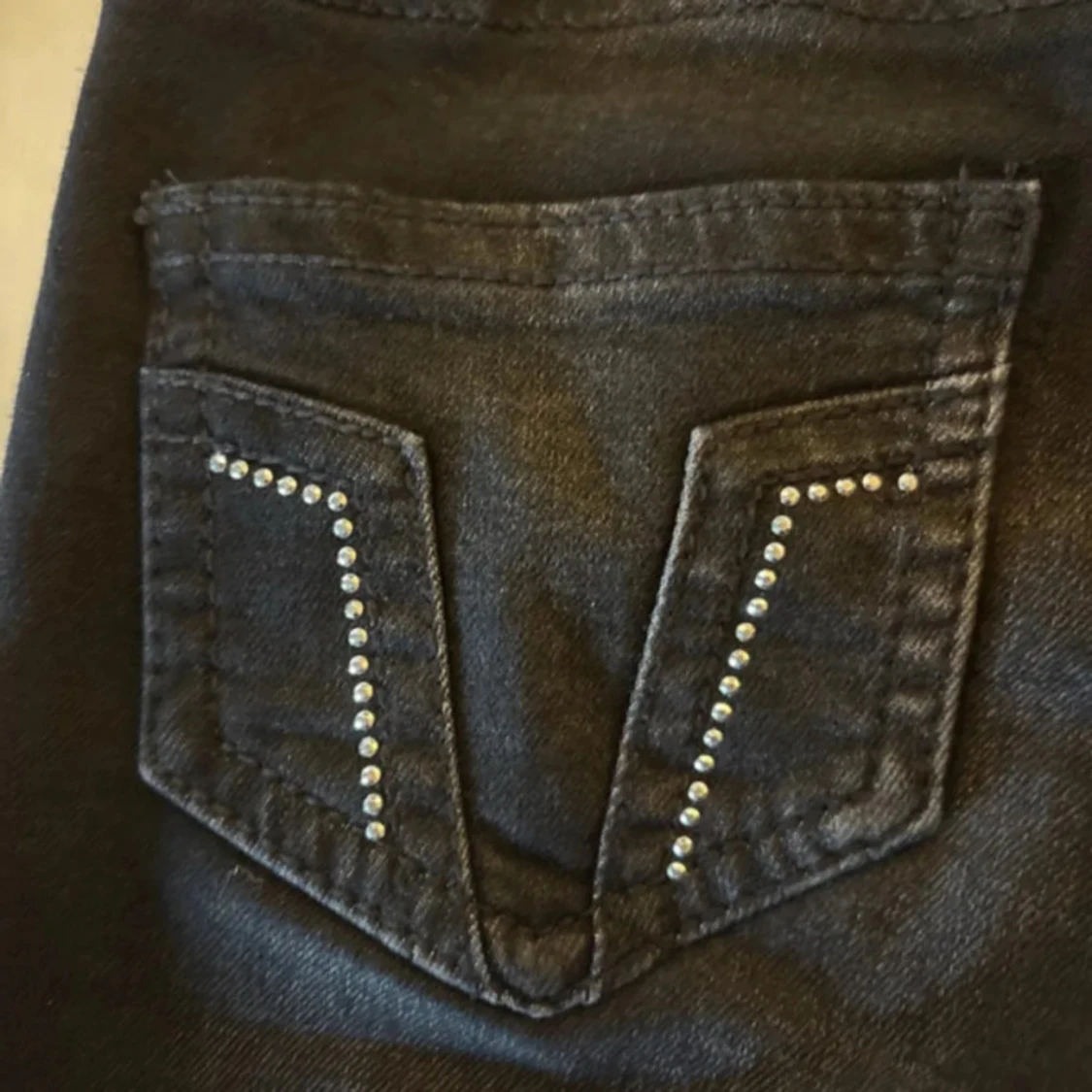 Snygga svarta jeans med bootcut passform och låg midja. Bakfickorna har coola detaljer med silvriga nitar i V-form. Jeansen är i stretchigt denim och sitter tajt upptill med utsvängda ben. Perfekta för dig som gillar en trendig och edgy look.