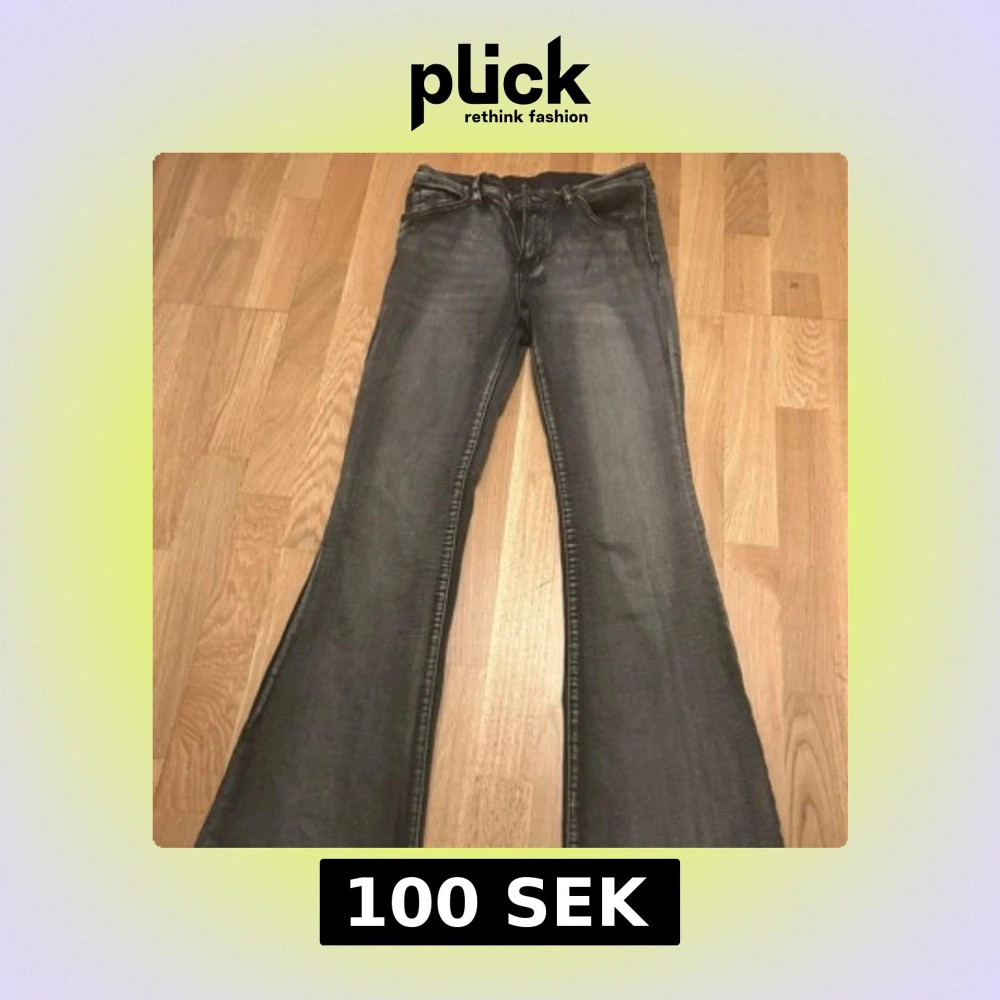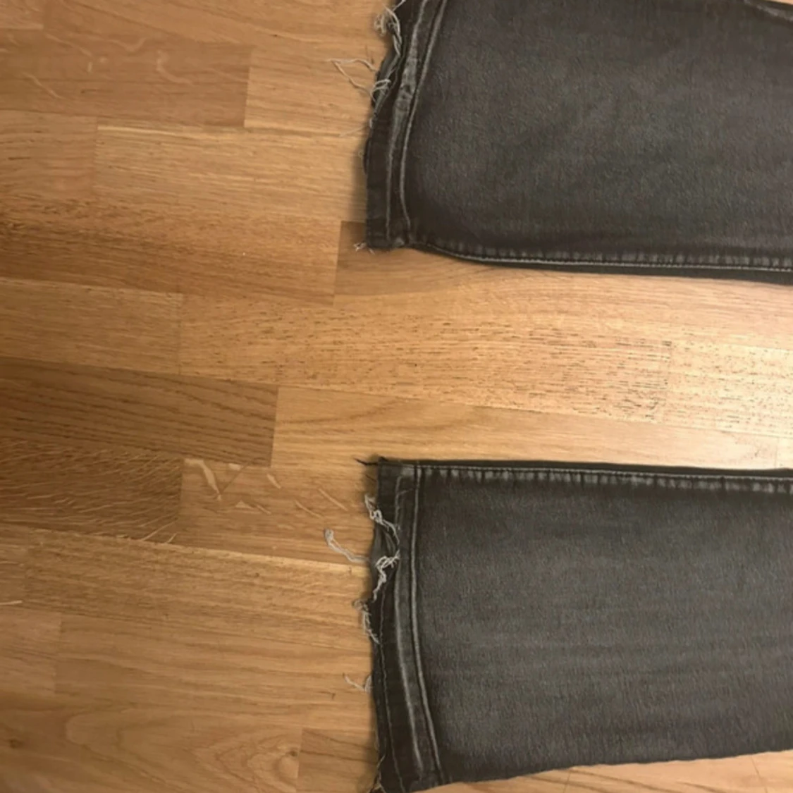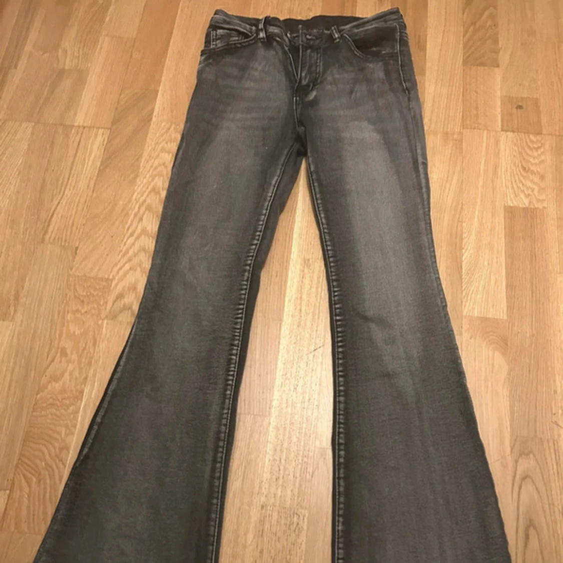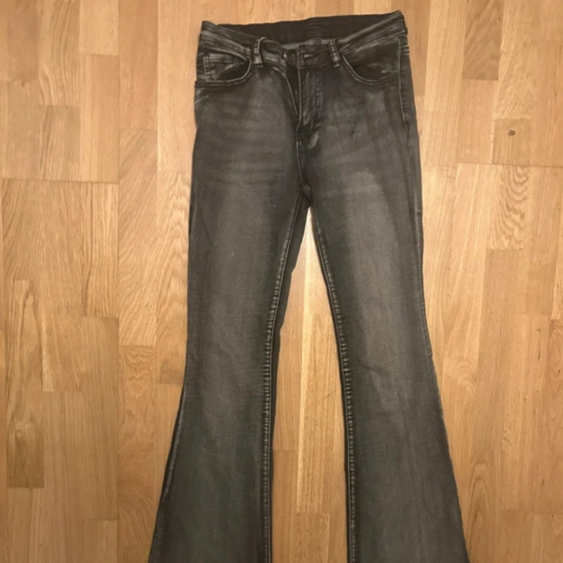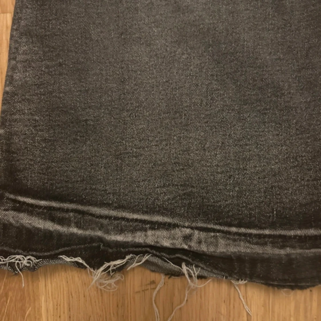 Snygga svarta jeans med bootcut-modell och rå, fransad kant nertill. Jeansen har klassisk femficksdesign och dragkedja. Materialet är jeans och färgen är tvättad svart med lätt slitning för en cool look. Har inte spilt något på dem, byxorna ska vara så!!