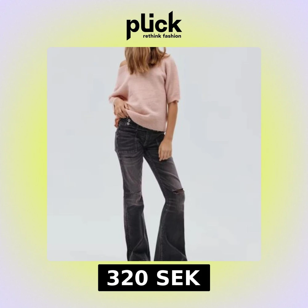 Snygga svarta bootcut jeans med slitningar på knäet och stora framfickor. Jeansen har låg midja och en lätt tvättad look som ger en cool vintagekänsla. Perfekta för dig som gillar en avslappnad och trendig stil. Storlek 158-164