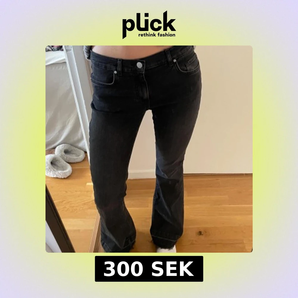 Snygga svarta bootcut jeans med låg midja. Perfekta för en avslappnad stil. Klassisk femficksdesign och knappgylf. ”Vanlig” baksida med fickor. Använt jeansen en gång. Storlek är 25/32
