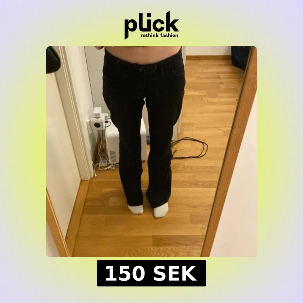 Säljer ett par svarta jeansbyxor från Lindex med bootcut-stil. Byxorna har normal passform och klassisk femficksdesign med knapp och dragkedja framtill. Perfekta för dig som gillar en tidlös look med lite utsvängda ben.