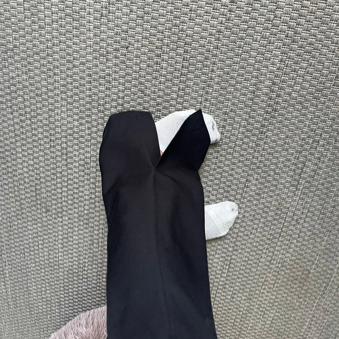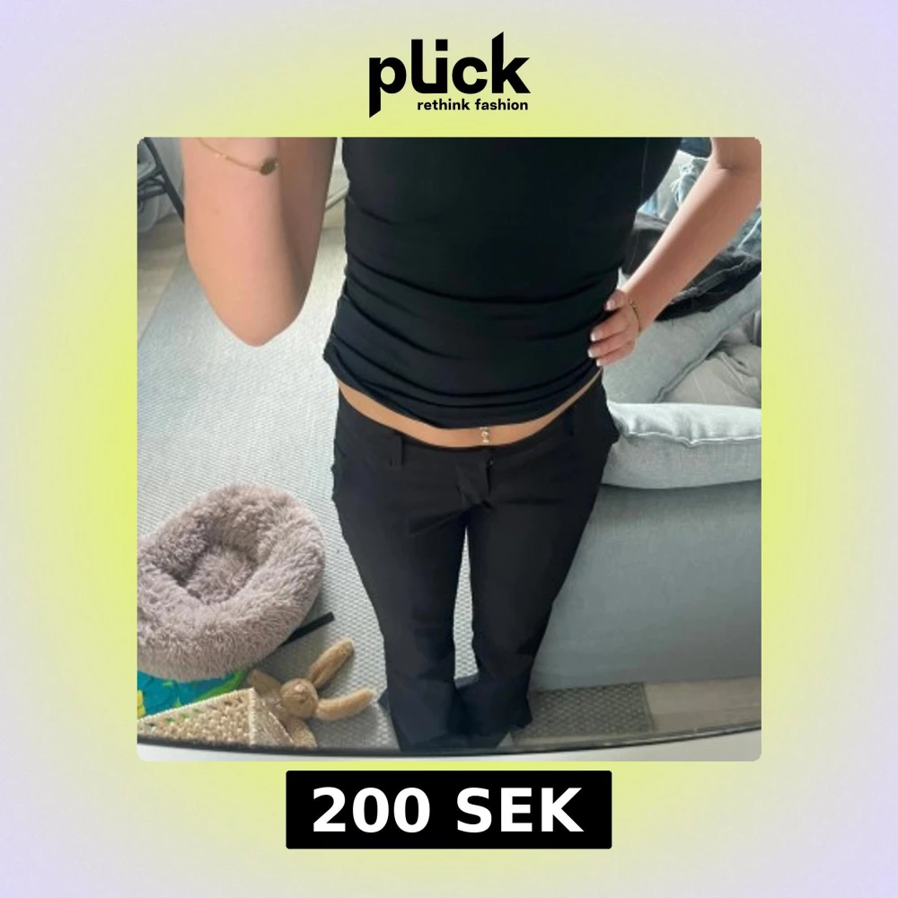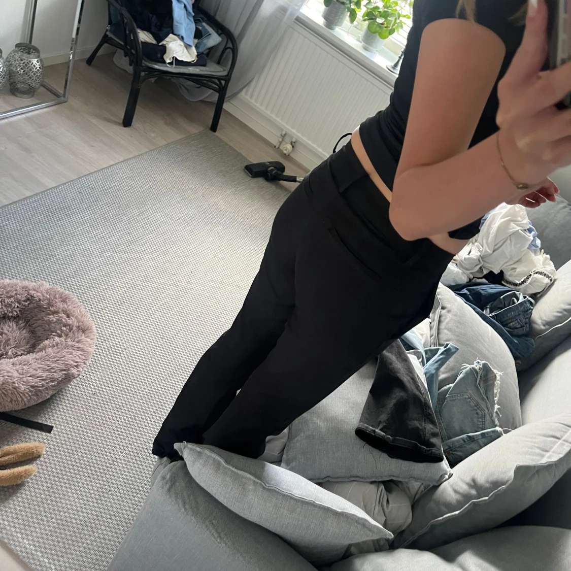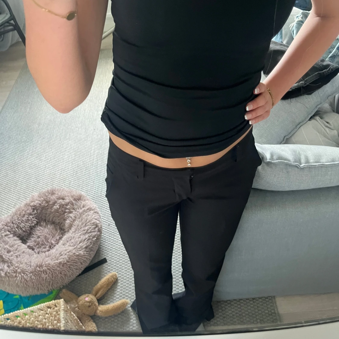 Snygga svarta kostymbyxor med bootcut-snitt och låg midja. Byxorna har klassiska fickor fram och bak, och är gjorda i ett mjukt och följsamt material som ger en clean och stilren look. Perfekta för dig som gillar en tidlös vibe med lite edge.