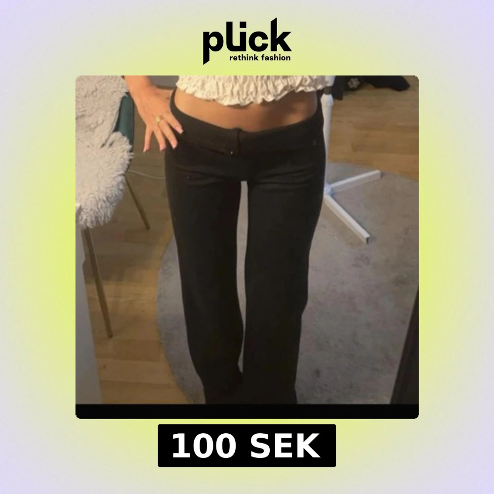 Säljer ett par svarta bootcut kostymbyxor. man kan vika ner dom så dom blir låga som jag gjorde på första bilden. lite defekter längst ner då dom är lite långa på mig så jag har trampat där. Mjukt material
