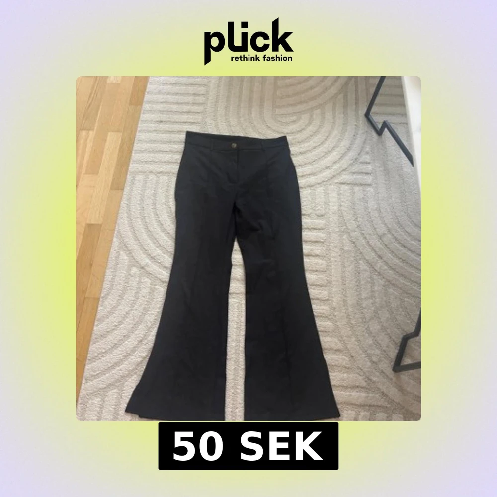 Svarta kostymbyxor med bootcut-silhuett och klassisk knappstängning. Byxorna har en snygg, utsvängd passform och är perfekta för en stilren look. Materialet känns mjukt och följsamt, och midjan är normalhög.