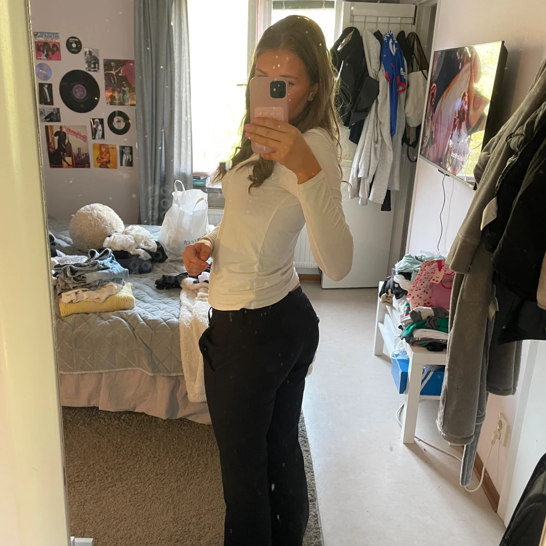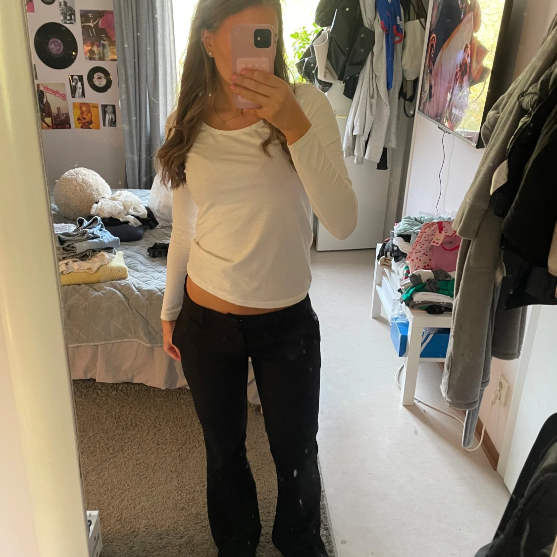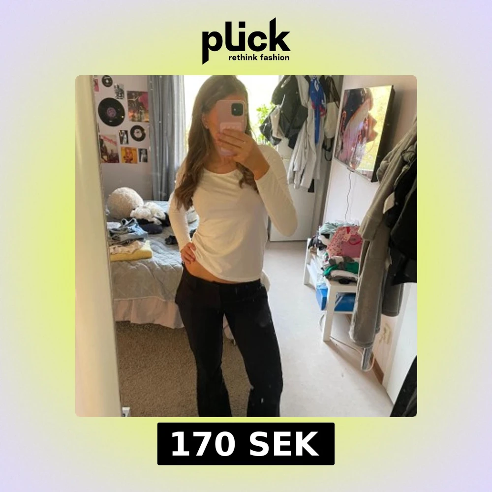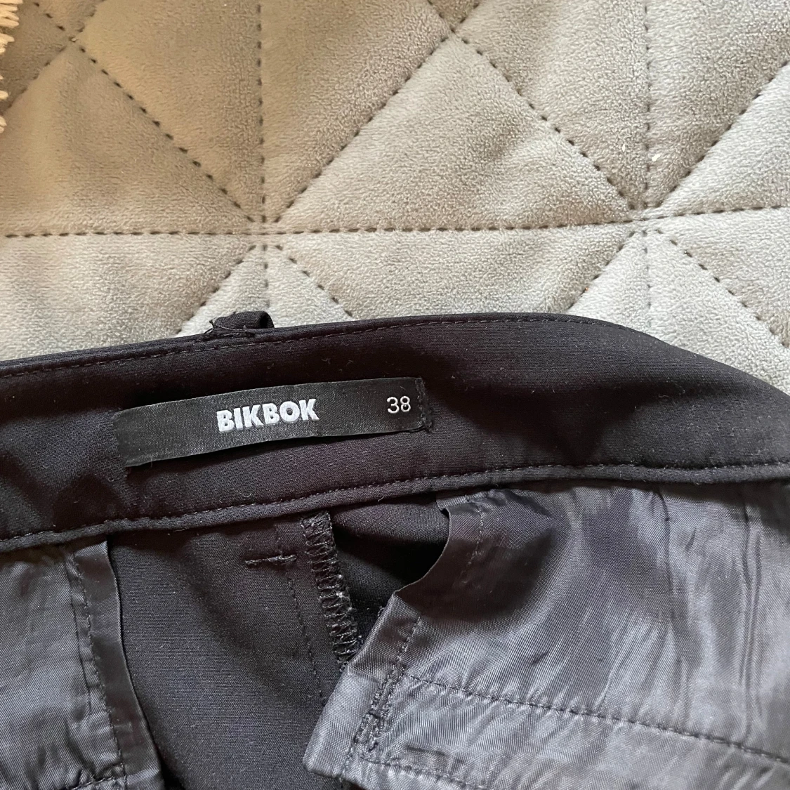 Snygga svarta bootcut-byxor från BikBok i storlek 38 men skulle säga att det är en 36. Byxorna har låg midja och ett klassiskt, stilrent snitt med lätt utsvängda ben. Materialet är mjukt och följsamt, perfekt för dig som gillar en clean look. Passar dig som vill ha en trendig siluett. Jag är 167 och byxorna var lite för långa för mig så har gått sönder de någon cm längst ner, men annars bra skick
