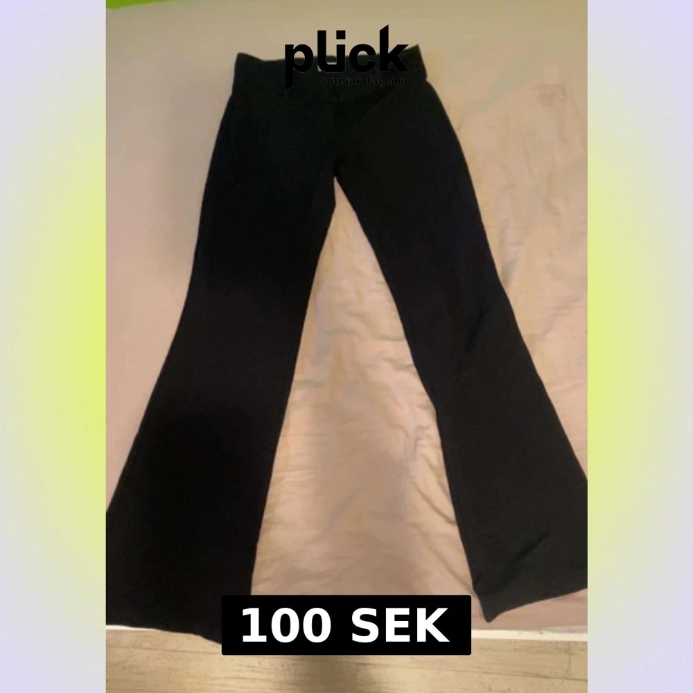 Säljer ett par svarta bootcut byxor från Nelly i storlek 34. Byxorna har låg midja och sitter snyggt över höfterna innan de blir vidare nedtill. Materialet är mjukt och stretchigt, vilket gör dem riktigt sköna att ha på sig. Perfekta för dig som gillar trendiga silhuetter.