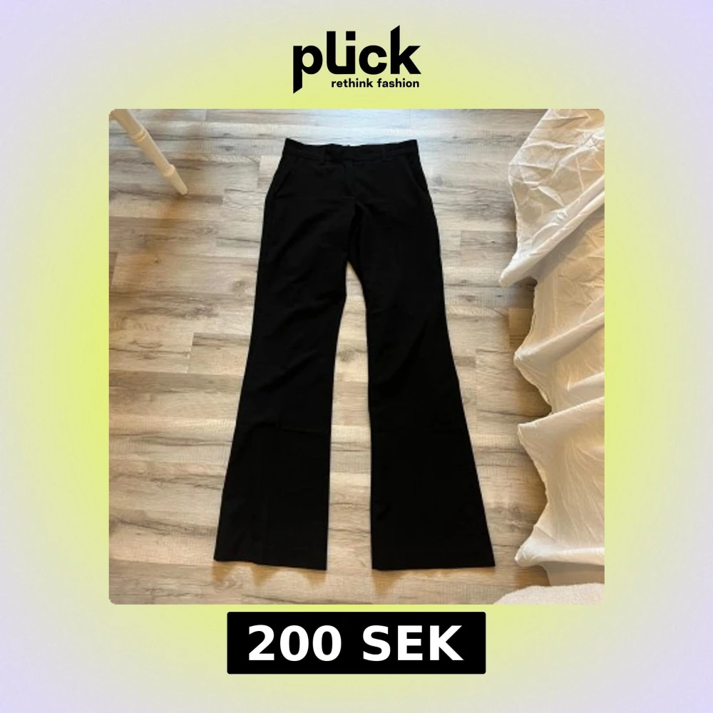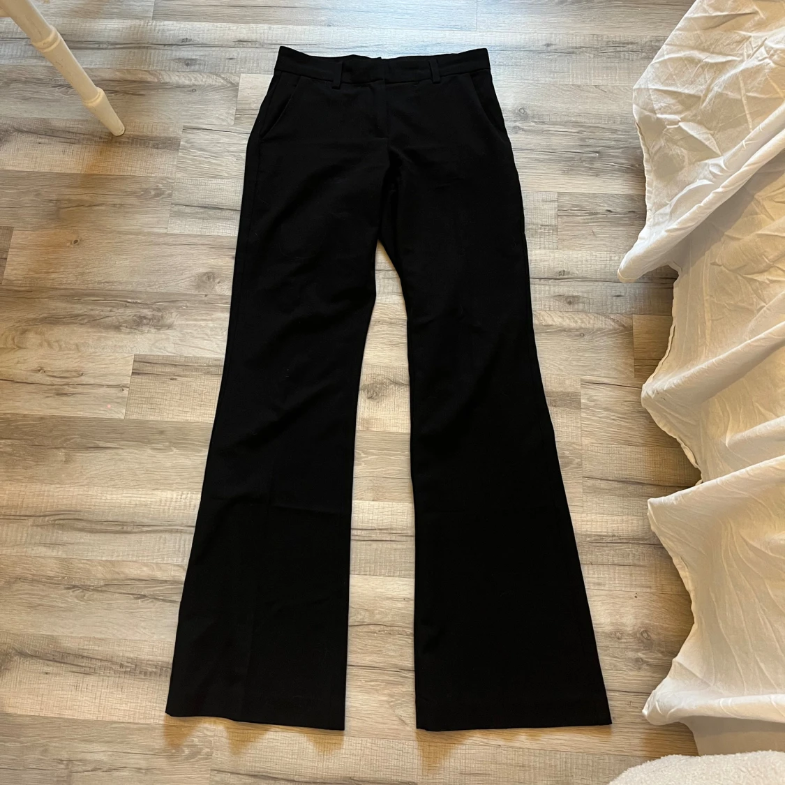 Svarta kostymbyxor med bootcut-snitt och klassiska fickor framtill. Byxorna har hällor för bälte och en stilren, tidlös look som passar till många olika outfits. Perfekta för dig som gillar en lite vidare passform nertill.