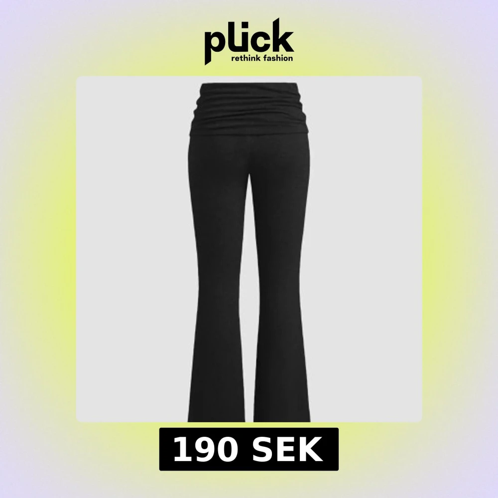 Svarta mjukisbyxor med bootcut-silhuett och bred, rynkad midja. Byxorna är stretchiga och har en skön passform som sitter snyggt över höfterna och släpper ut vid benen. Bilder från hemsidan, jag skickar gärna fler om det behövs!