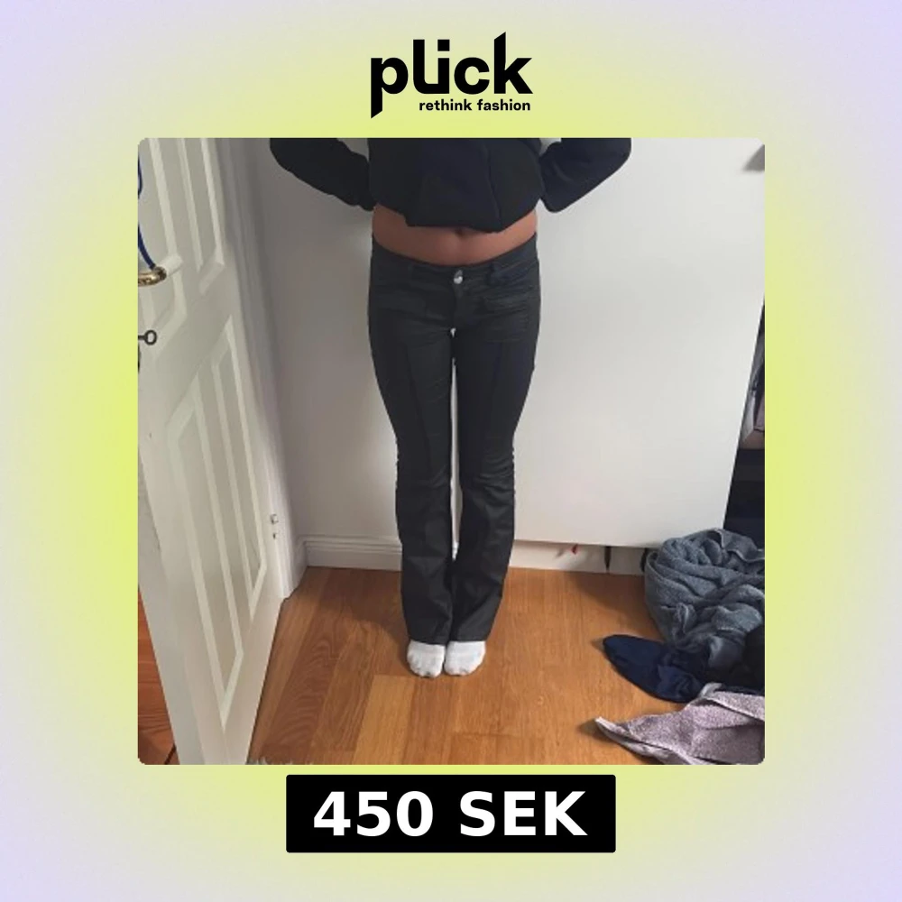 Säljer ett par svarta byxor med bootcut och snygga fickdetaljer framtill. Byxorna har låg midja, dubbla knappar och är gjorda i ett glansigt material som ger en cool look. Perfekta om du vill sticka ut lite extra.