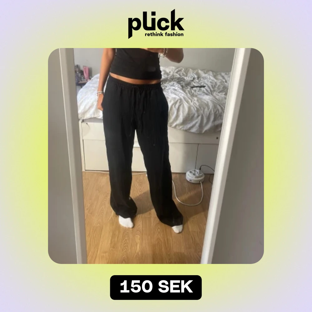 Ett par svarta byxor med elastisk midja och lös passform. Byxorna är långa och har en avslappnad stil, vilket gör dem bekväma för vardagsbruk.