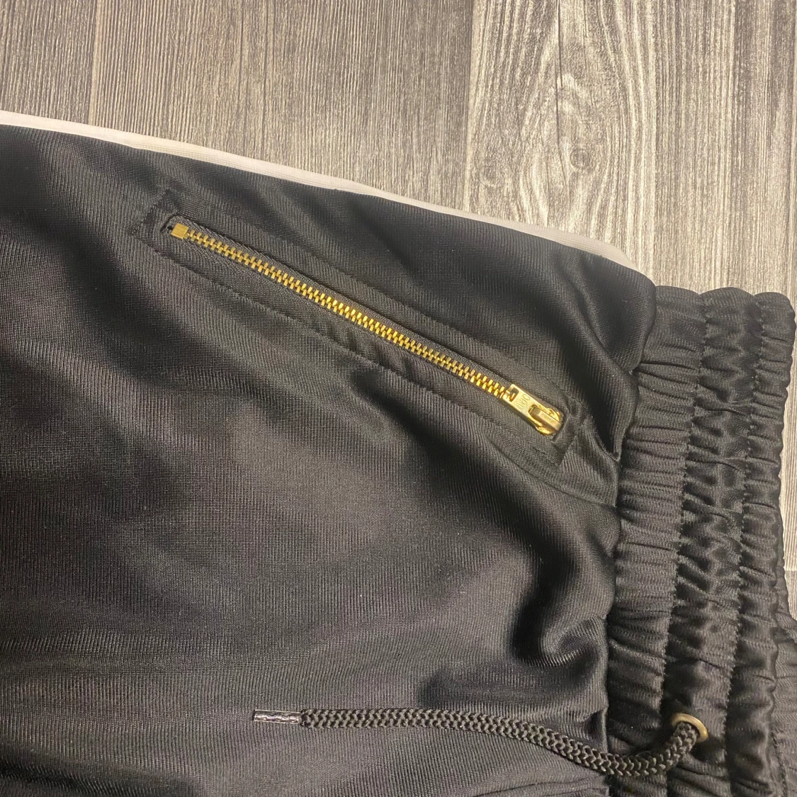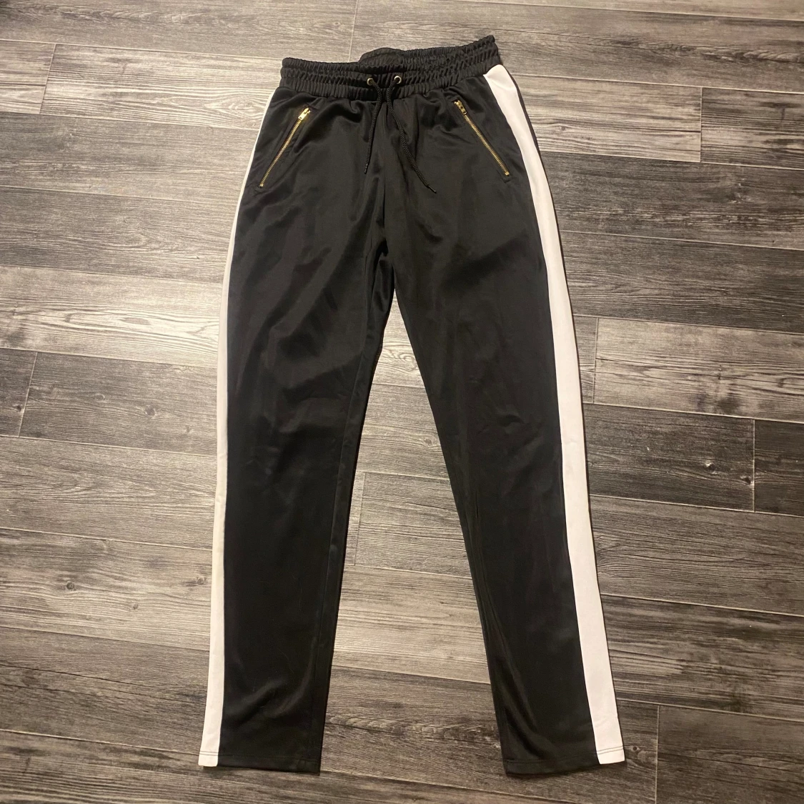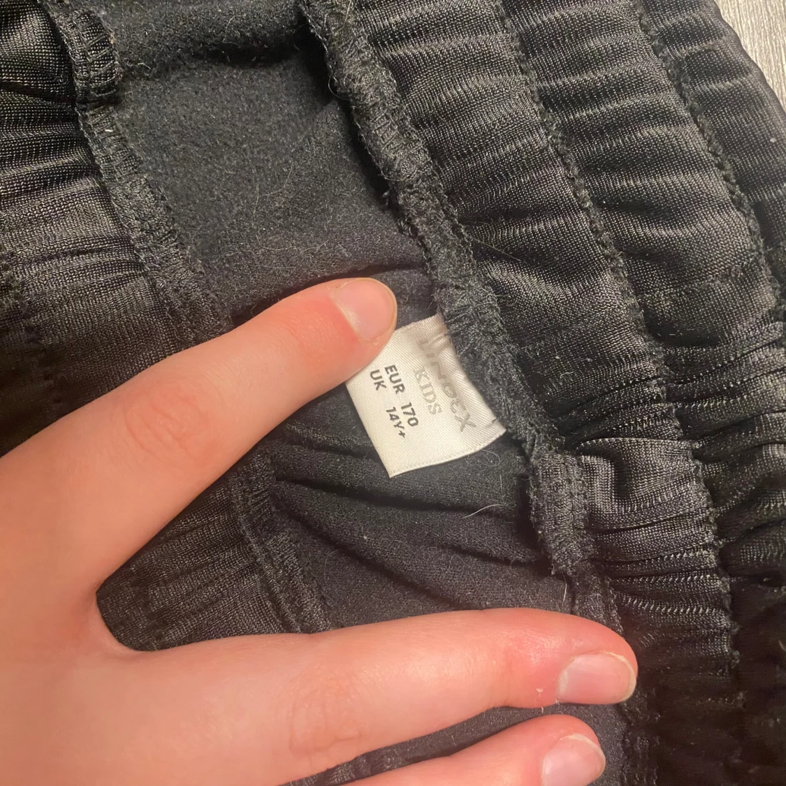 Byxor från Lindex som är svarta med vita sträck på sidorna och guld detaljer, fick dom av en kompis men har aldrig använt dom. Storlek 170 i barnstorlek men jag som haft M har kunnat ha dom.