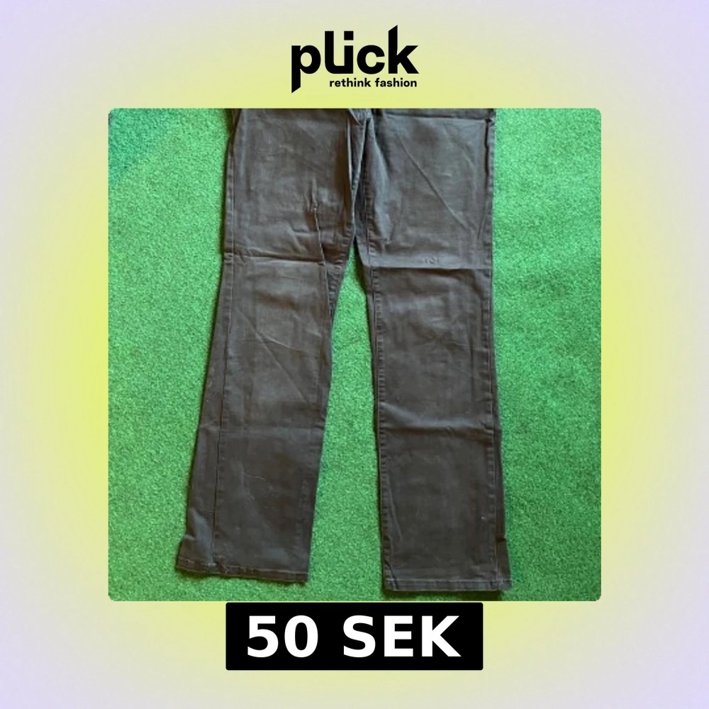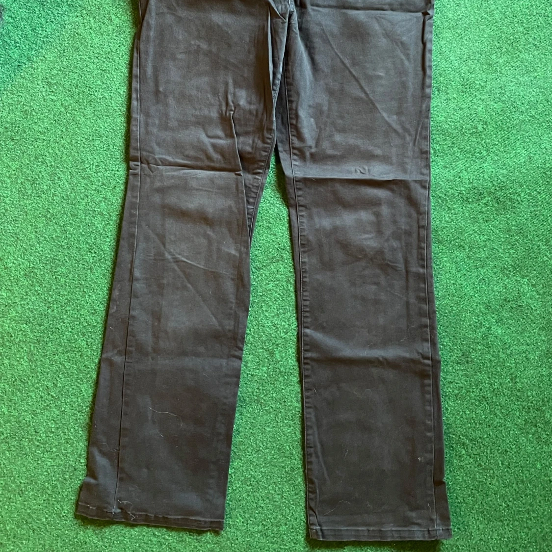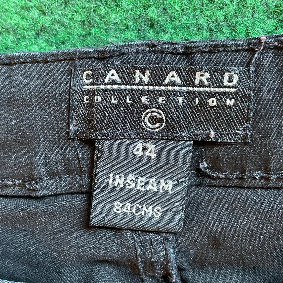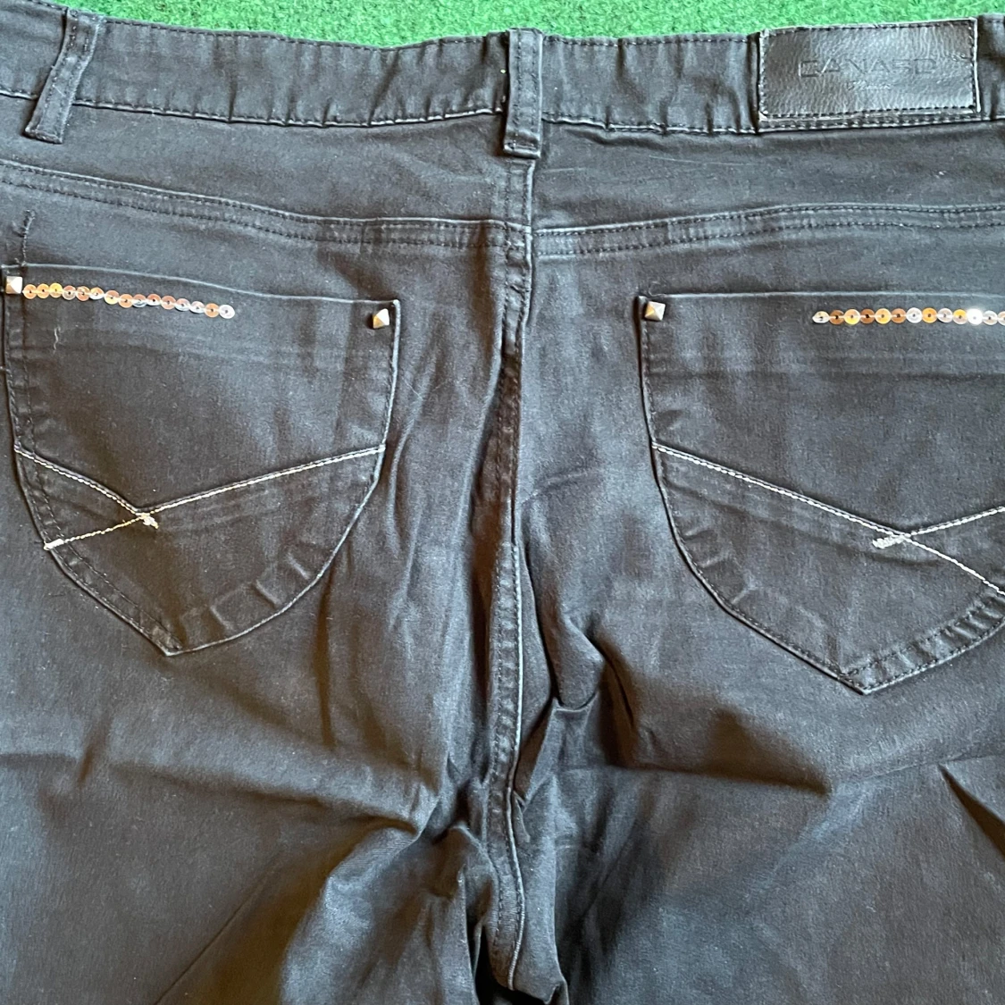 Svarta byxor från Canard Collection i storlek 44. Byxorna har raka ben, dekorativa paljetter på bakfickorna och kontrastsömmar. Materialet känns mjukt och har en lätt stretch. Perfekta för dig som gillar en stilren look med lite extra detaljer.