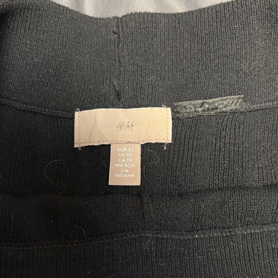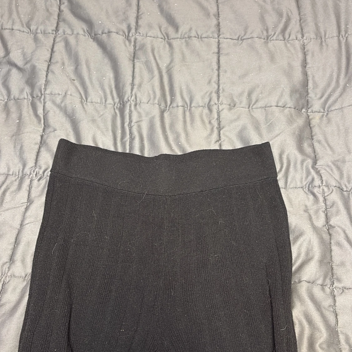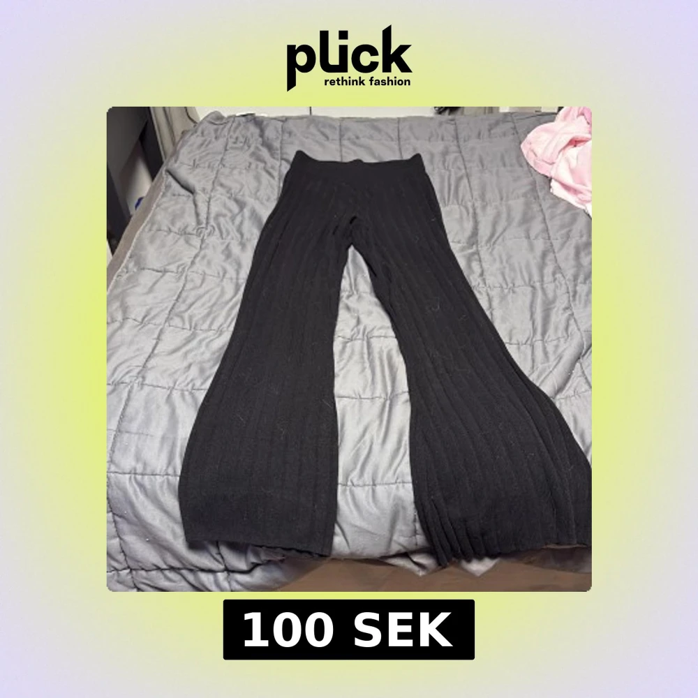 Det är ett par svarta högmidjade byxor som är uthängda ner till och det går att vika ner dom satt dom blir lågmidjade om man vill det, det är storlek xs på dom och jag är 157cm och dom är lite för långa för mig men det går att ha dom ändå