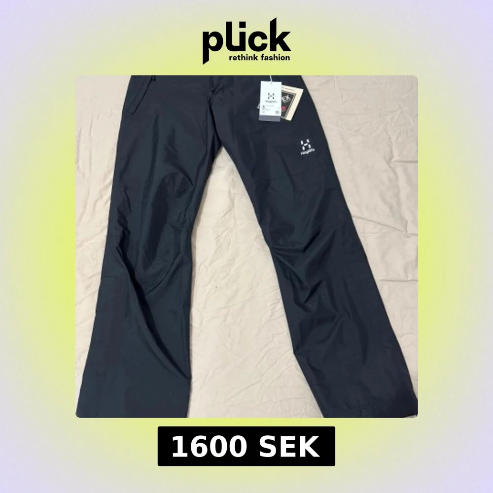 Säljer ett par svarta byxor från Haglöfs. De har en rak passform och är tillverkade i ett syntetmaterial. Byxorna har en dragkedja och knappar framtill samt en diskret logga på benet.