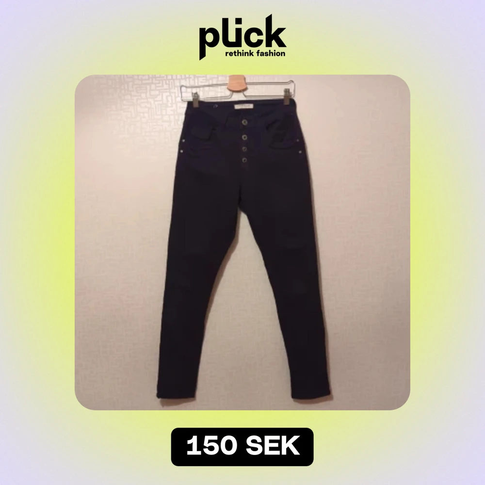 Säljer ett par mörkblå byxor från Jewelly i storlek XS/34. De är högmidjade med knappar framtill och har en skinny passform. Sparsamt använda.