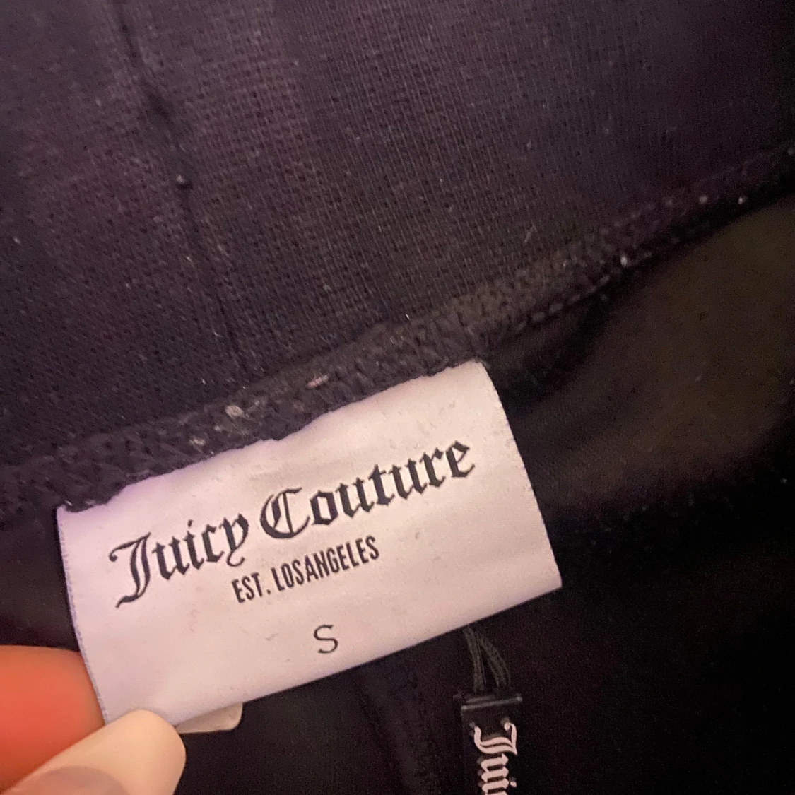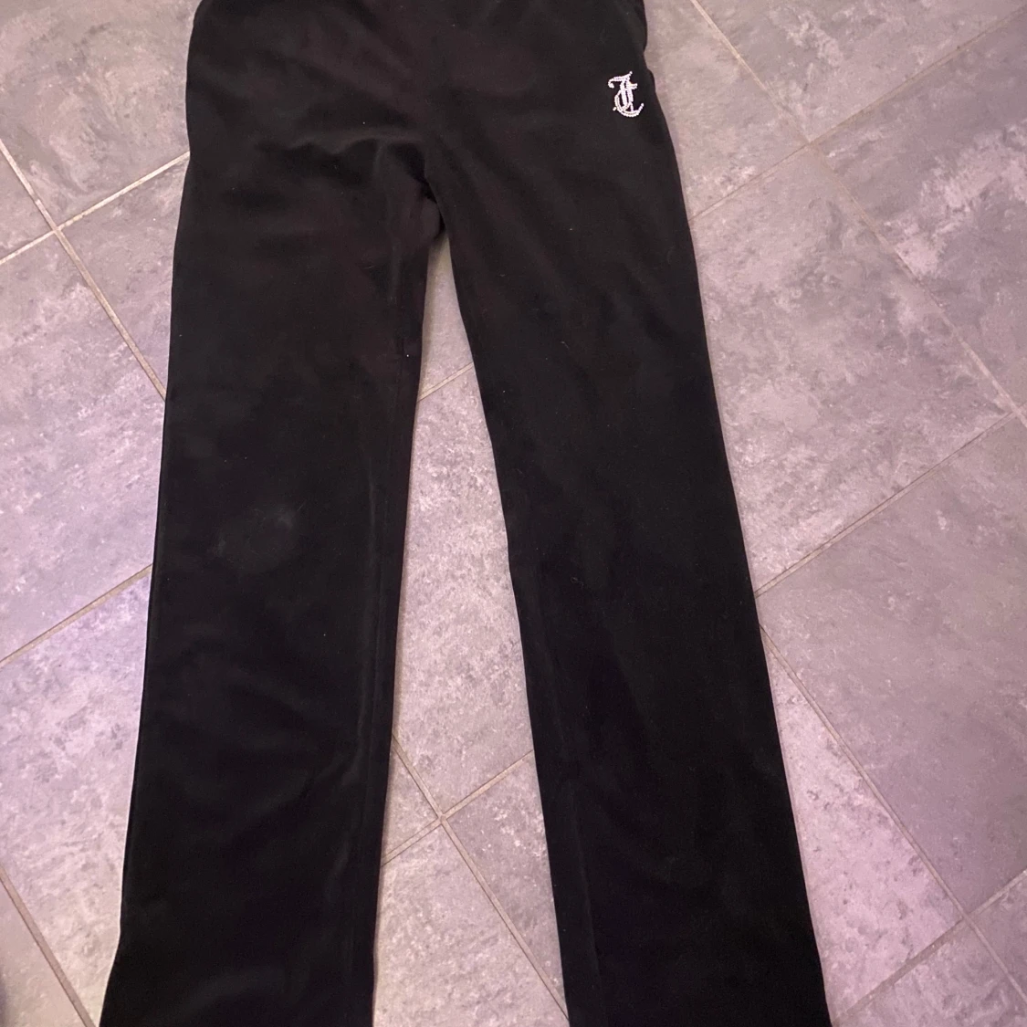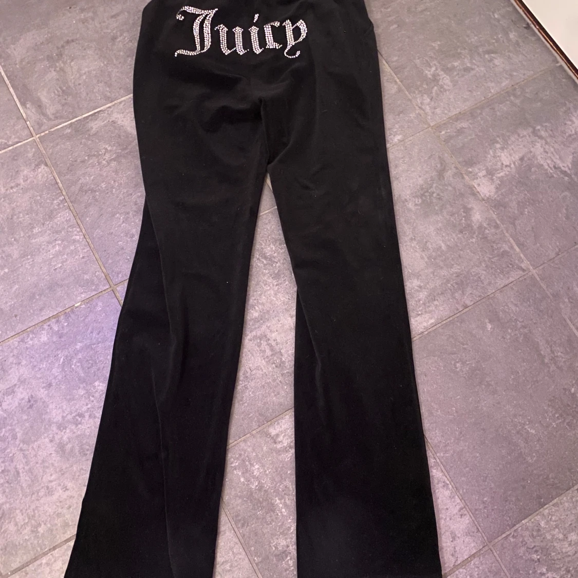 Snygga svarta byxor från Juicy Couture med glittrande text på baksidan. Perfekta för en avslappnad och stilren look. Byxorna har en bekväm passform och är tillverkade i ett mjukt material. Dock har resåren på kanten snurrat dig.