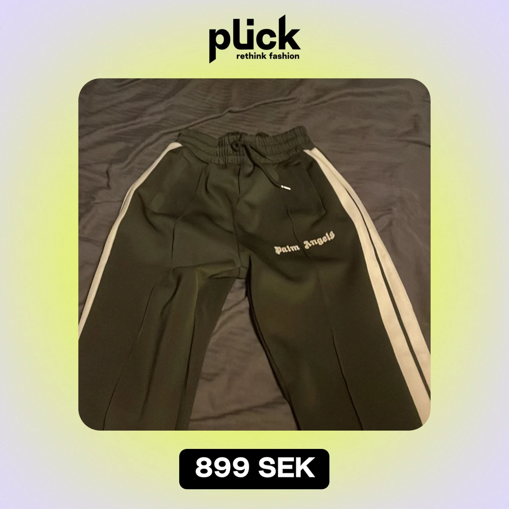 Säljer ett par svarta byxor från Palm Angels med vita ränder längs sidorna. De har snören och qr coden funkar att Scana. Har använt dem en eller två gånger men är i bra skick. S men passar M. Äkta!