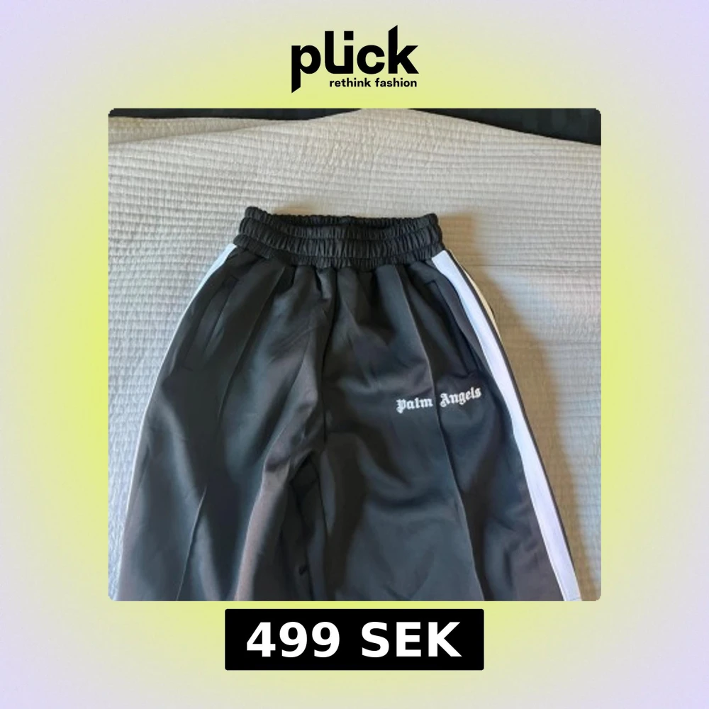 Snygga svarta byxor från Palm Angels med vita och svarta ränder längs sidorna. Byxorna har en elastisk midja för extra komfort och stil. Perfekta för en avslappnad look. Helt nya med tags!