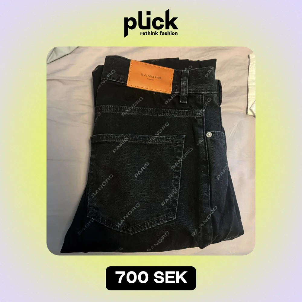 Jag är 1.79cm! Säljer ett par svarta byxor från Sandro i helt nytt skick. De har en normal passform och är perfekta för både vardag och fest. Byxorna har en klassisk design med fickor och en snygg detalj med en läderlapp baktill.