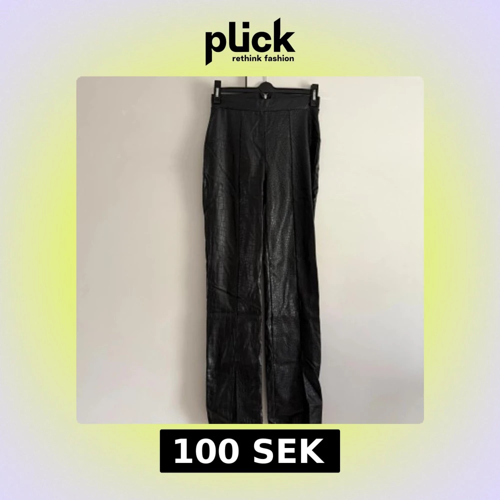 Säljer ett par svarta byxor i fejkskinn med croco-präglat mönster. Byxorna har hög midja och dragkedja bak. Snyggt raka ben och stilren look som sticker ut med den glansiga ytan och strukturen.