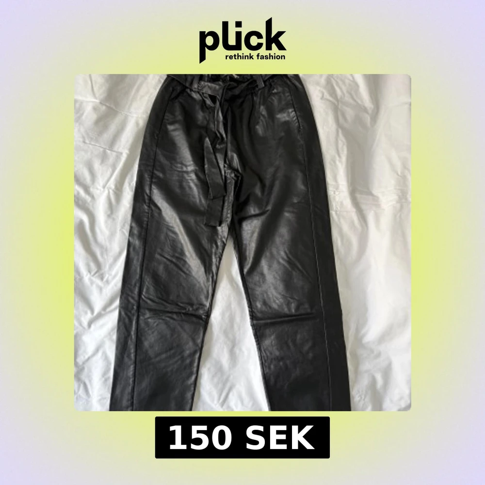 Snygga svarta byxor i syntetmaterial från House of Lola. Byxorna har en hög midja med knytband och en stilren design. Perfekta för en trendig look. Byxorna sitter lite lösare och är supermjuka och sköna. Lite tunnare och med croppad längd. Jag är 163 cm lång.