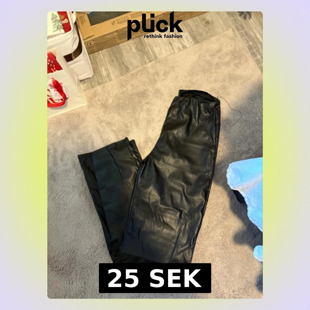 Säljer ett par svarta byxor i läderimitation med resår i midjan. Byxorna har en rak och loose passform, perfekta för dig som vill ha en edgy och trendig look. Materialet är syntetiskt och ger en cool läderkänsla.