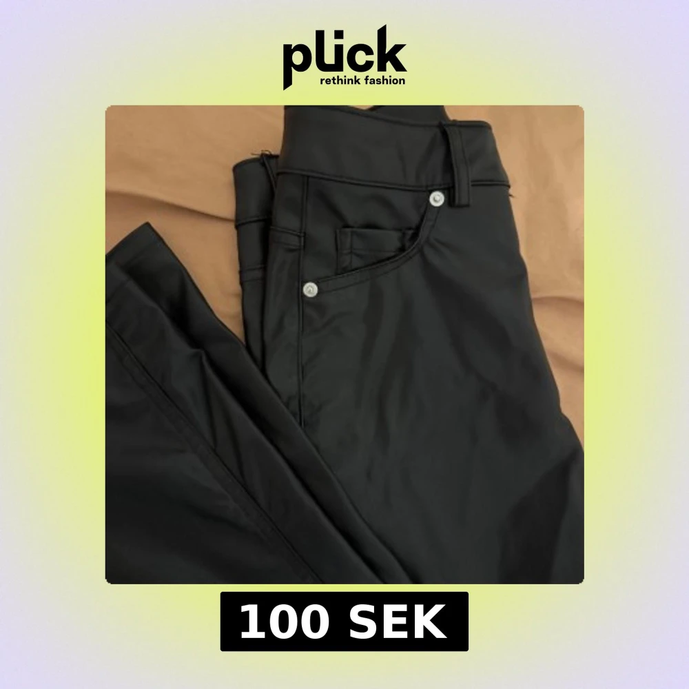 Snygga svarta byxor i skinnimitation med raka ben och klassisk femficksdesign. Byxorna har silverfärgade knappar och bälteshällor, vilket ger en stilren look. Perfekta för dig som vill sticka ut med en edgy vibe.storleken är 32