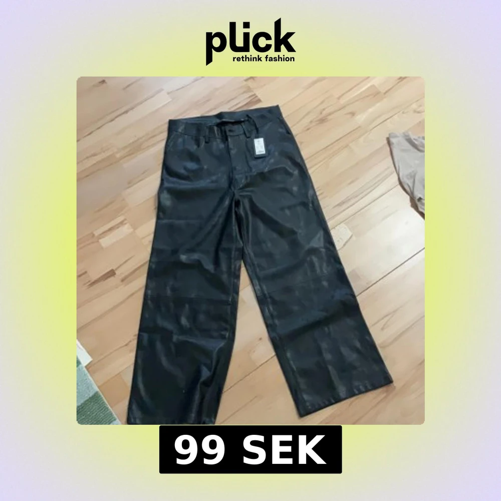 Snygga svarta byxor i syntetmaterial med hög midja och vida ben. Byxorna har en dragkedja framtill och bälteshällor för extra stil. Perfekta för en trendig look.