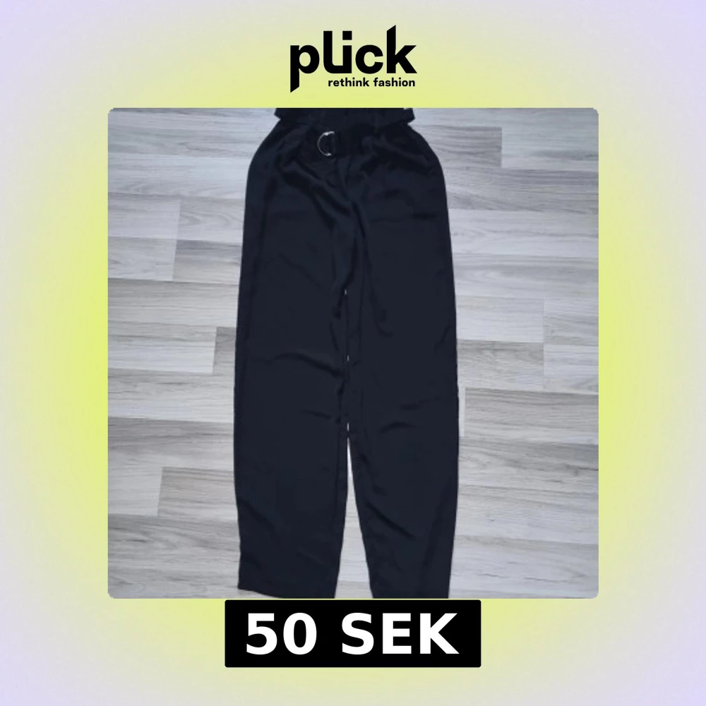 Svarta byxor från BikBok i storlek XS med hög midja och papperspåse-linning. Byxorna har ett tygbälte med metallspänne och vida ben. Materialet är mjukt och lätt, perfekt för en chill och stilren look.