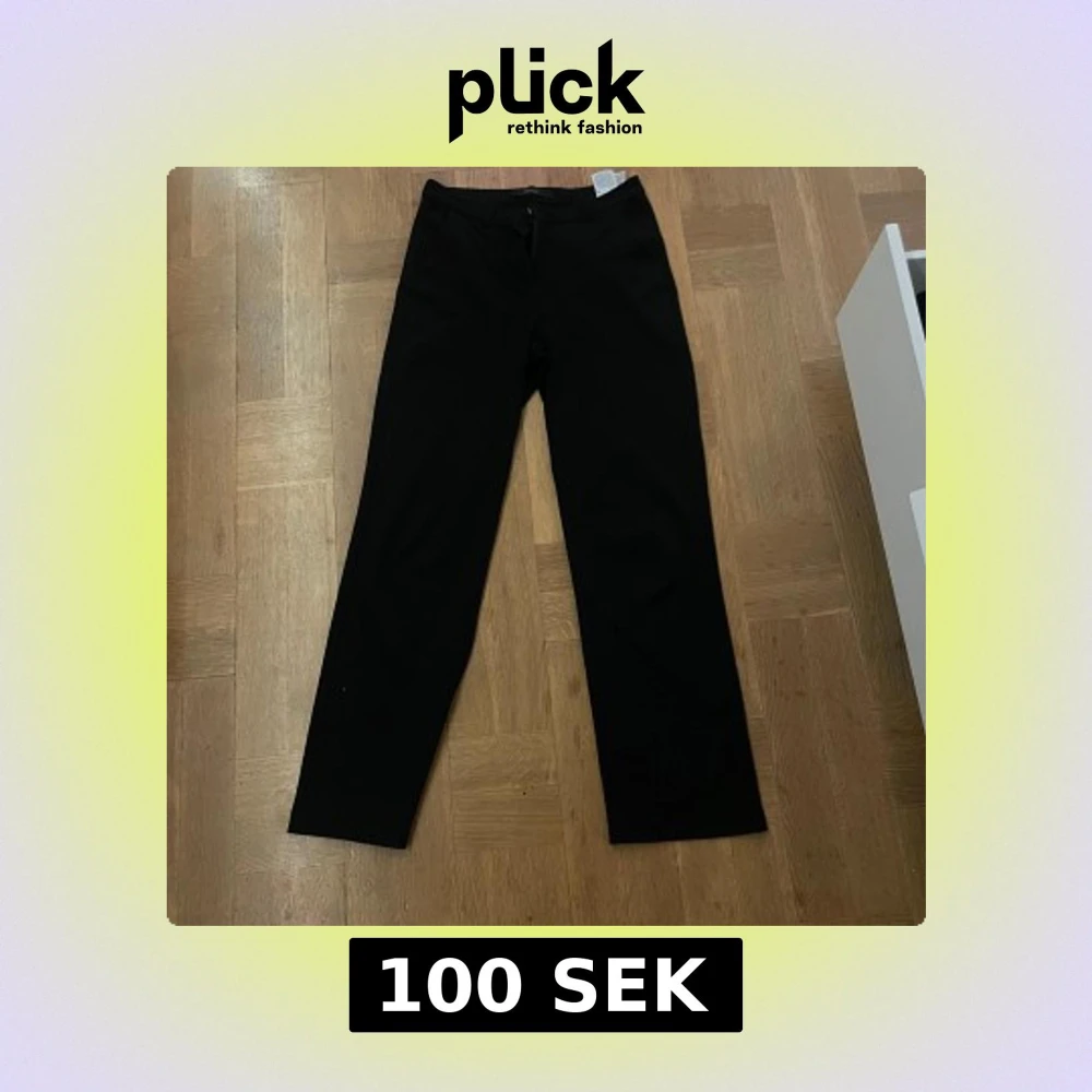 Snygga svarta byxor med dragkedja och knapp framtill. De har en rak passform och är perfekta för en stilren look. Materialet ser ut att vara mjukt och bekvämt. (Dålig sista bild, hör av er om ni vlll ha bättre)
