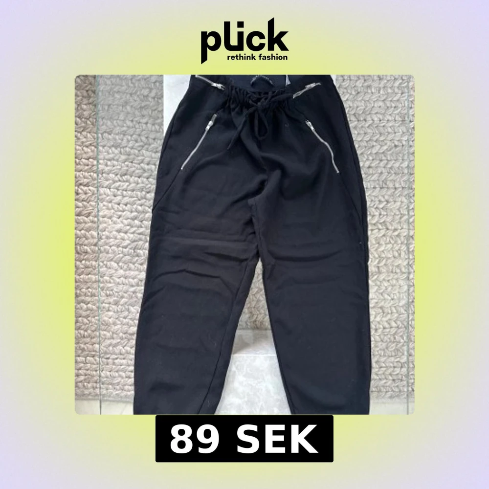 Svarta byxor med elastisk midja och snörning, samt dragkedjor vid fickorna framtill. Byxorna har resår vid bensluten för en skön och avslappnad passform.