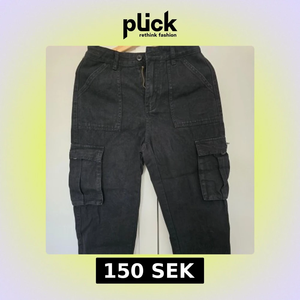 Säljer ett par svarta byxor med stora fickor på sidorna och bakfickor med lock och knapp.