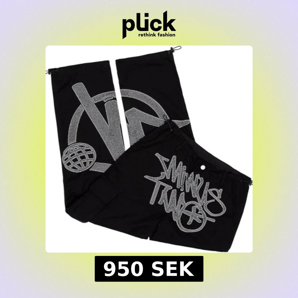 Coola svarta byxor med stort grafiskt tryck i silvriga stenar. Byxorna har en loose passform och dragsko vid bensluten för justerbar stil. Perfekta för en avslappnad och trendig look. Priset går att diskuteras. Köpta på minus two.