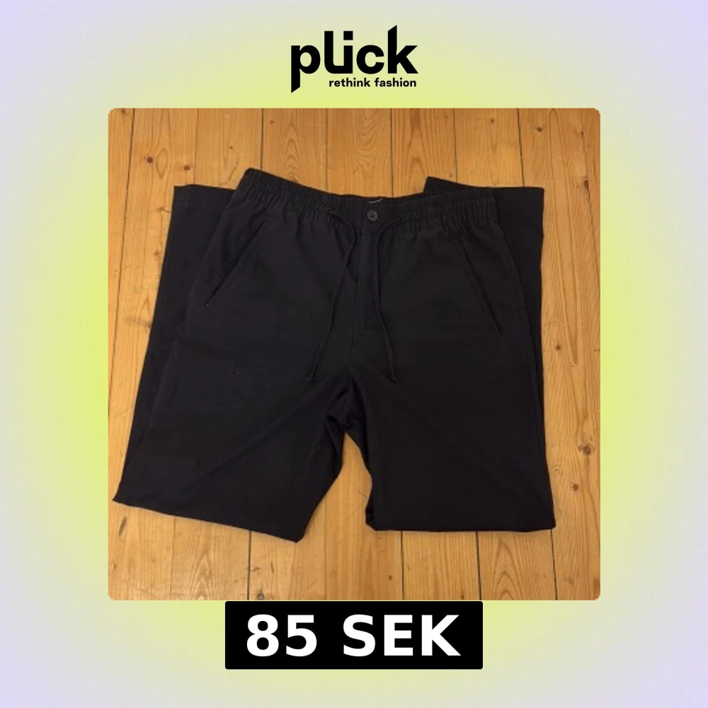 Svarta byxor från H&M med elastisk midja och dragsko. Byxorna har raka ben, sidofickor och en bakficka. Perfekta för en avslappnad stil och enkel att matcha med olika plagg.