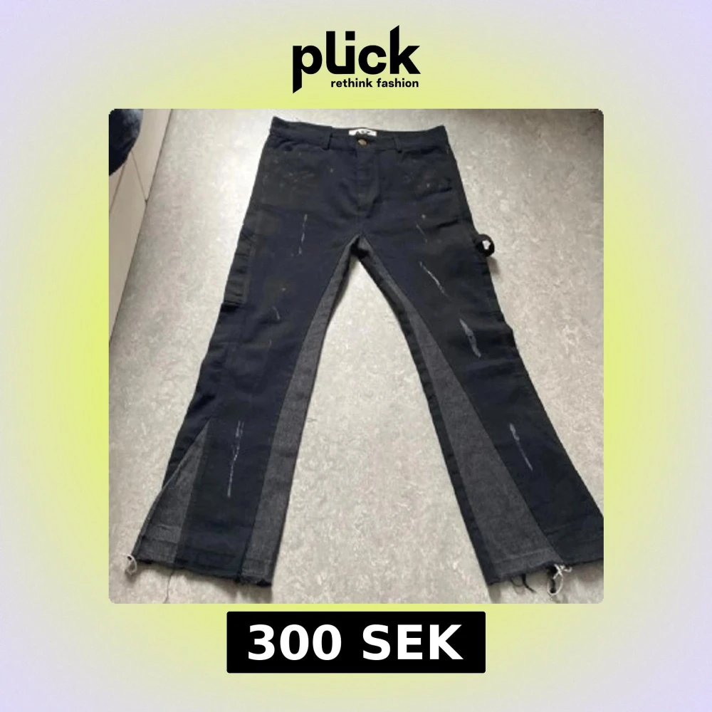Snygga svarta utsvängda (flared) jeans med unika slitdetaljer och slits vid bensluten. Byxorna har en normal passform och är perfekta för en trendig look. De har en knappstängning och bälteshällor för extra stil. Använda fåtal gånger. Vid frågor eller bilder är det bara att skriva