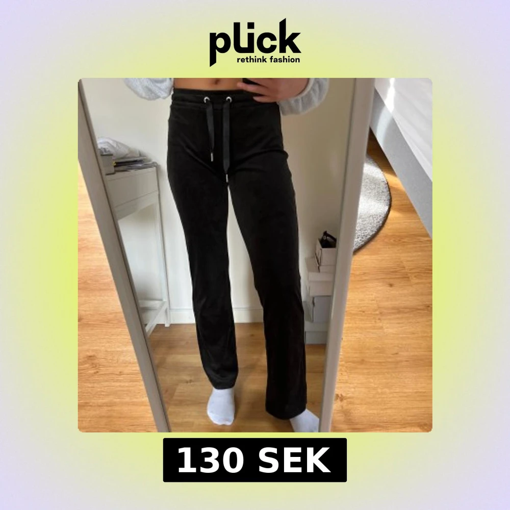 Snygga svarta velourbyxor med hög midja och snörning i midjan. Byxorna har en rak passform och är perfekta för en avslappnad stil. De är tillverkade i ett mjukt material. Dessa är lite för små på mig så de är nog snyggare på nån som är kortare än 170 cm 🤍