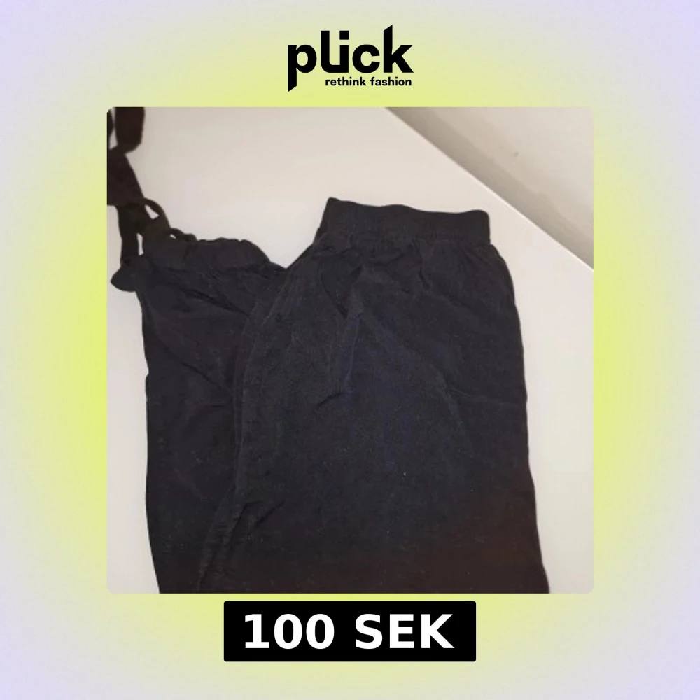 Säljer ett par svarta byxor med snörning i midjan och vid benen. Perfekta för en avslappnad stil och bekväma att bära. Byxorna har en loose passform och är tillverkade i ett mjukt material.