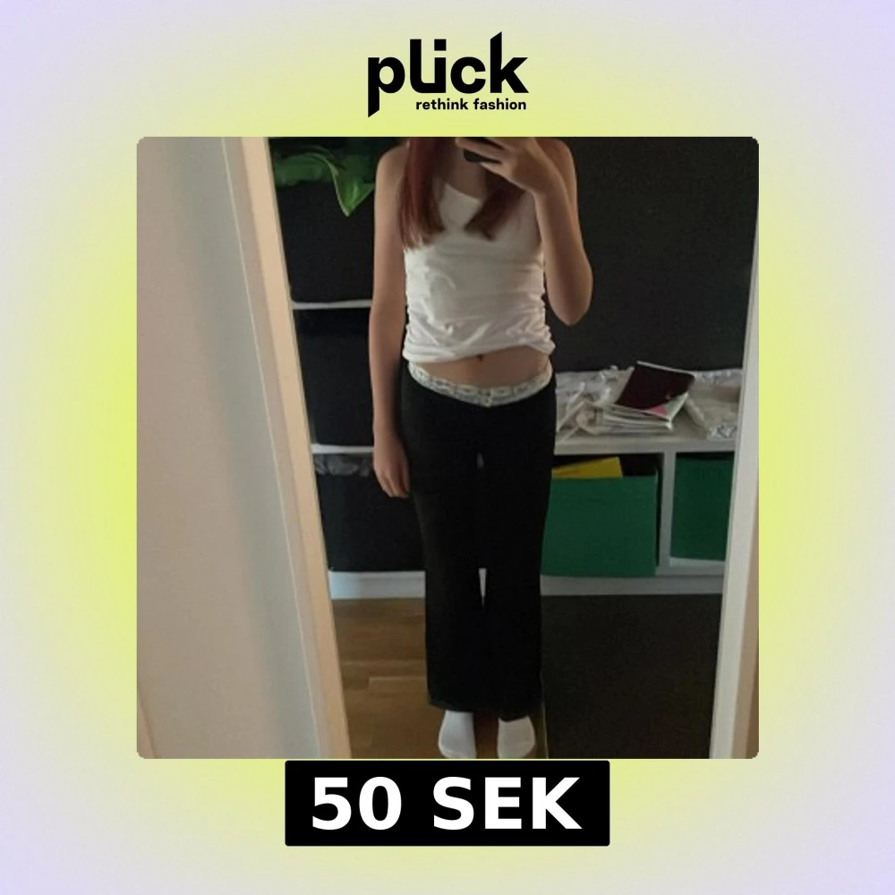 Snygga svarta byxor med en unik spetsdetalj i midjan. Byxorna har en rak passform och är perfekta för en stilren look. De är tillverkade i ett mjukt och bekvämt material som ger en skön känsla hela dagen. Bootcut