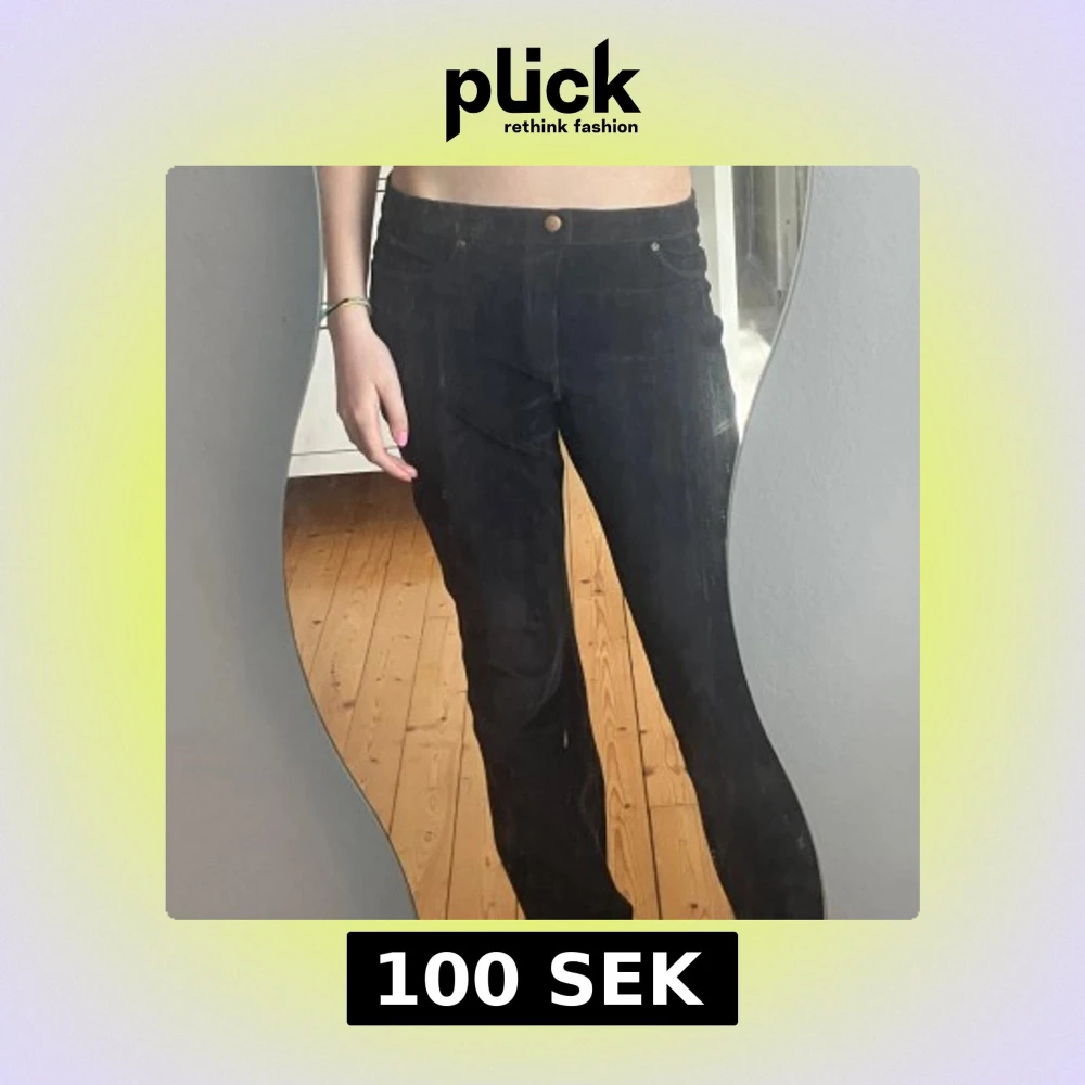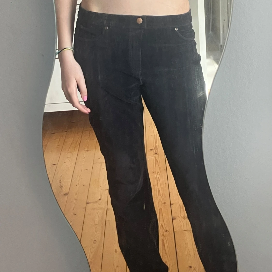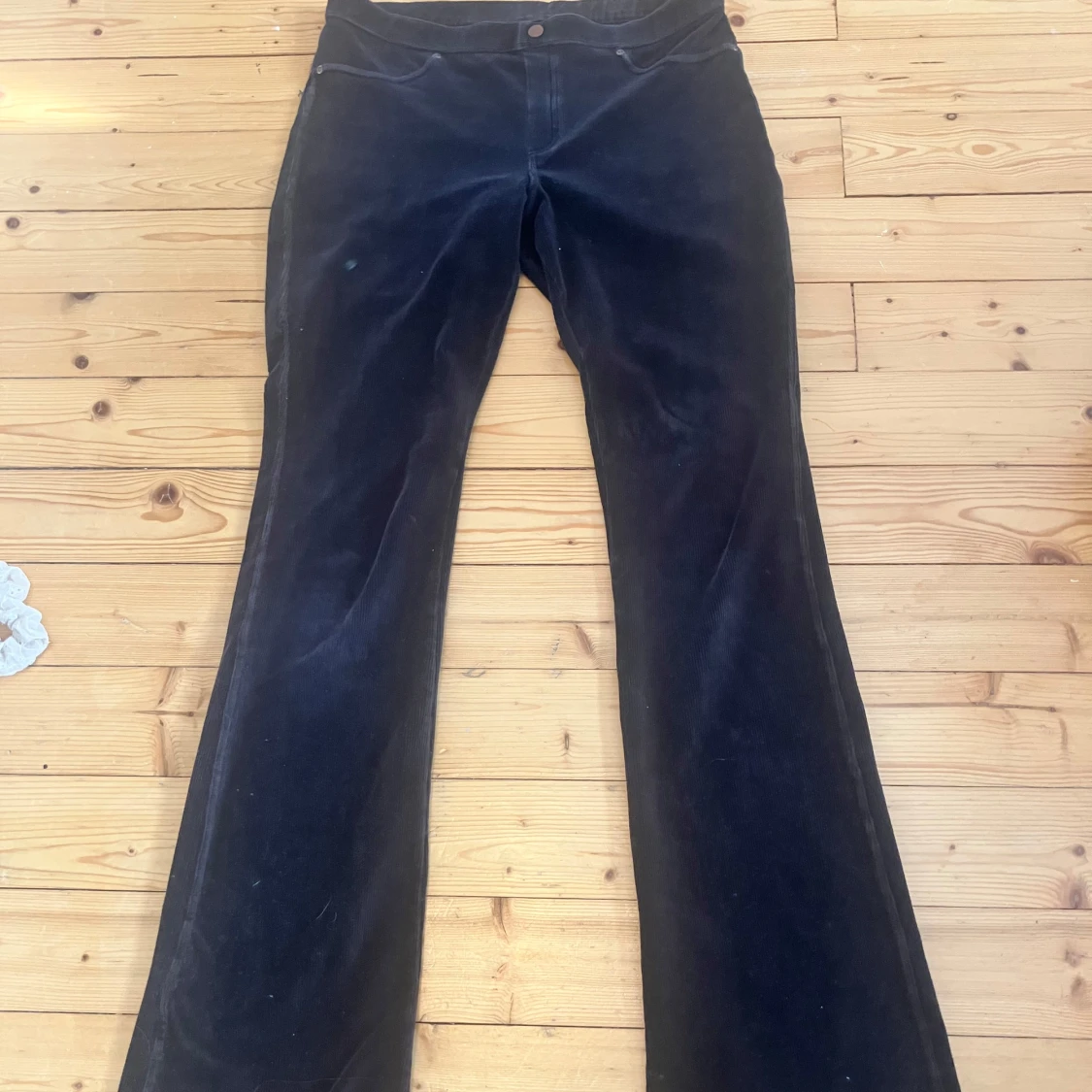Snygga svarta byxor som är mjuka och har bootcut-stil och är randiga. Byxorna har klassiska fem fickor och en knapp framtil, det står ingen storlek men skulle gissa mellan S-M